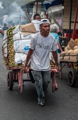 Keywords: maracaibo venezuela man working cart market pulling load bananas outside