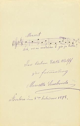 Keywords: Marcella Sembrich Albumblatt.jpg Marcella Sembrich Albumblatt mit Unterschrift Berlin 8 Februar 1898 Notenzitat Deh vieni non tardar aus Mozarts Le nozze di Figaro gewidmet der lieben Edith Wolff zur Erinnerung Marcella Sembrich http //www bassenge com/ 1898-02-08 Marcella Sembrich 1858-1935 PD-old-70-1923 Images from Galerie Bassenge Marcella Sembrich Le nozze di Figaro 1898 in Berlin 1898 documents |