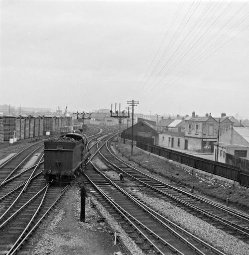 | Keywords: railways railroads trains tracks church road churchroad ireland saturday 12th march 1960 1960s sixties james p. o'dea jamespodea church road junction churchroadjunction dublin leinster brennan's brennans dublin-belfast railway bridge dublinbelfastrailwaybridge royal canal royalcanal m.g.w.r. mgwr midlands & great western railway midlandsgreatwesternrailway west road westroad signal cabin signalcabin sleeper creosoting plant sleepercreosotingplant creosote smith & pearson smithpearson signal arms signalarms junction newcomen road newcomenroad ossory road ossoryroad structural steel structuralsteel engineers iron works ironworks national library of ireland nationallibraryofireland o'dea photographic collection odeaphotographiccollection blackandwhite monochrome vehicle train outdoor sport railroad locomotive black and white We thought this was the view from a railway signal box at a Church Road in Roscommon, and as there are quite a few Church Roads in County Roscommon, we asked for help. Apparently, ask and you shall receive because it turns out this was Church Road Junction, but not in Roscommon at all! Flying Snail pinpointed the location exactly: "That's Church Road Jct in Dublin, down in the North Wall yards area. The view is looking west, with the bridge of the Dublin-Belfast line on the horizon. As the signal on one of the gantries is in the 'off' position, the loco is coming towards O'Dea presumably to shunt or take out of a goods train. The Brennan's shop is now an ordinary residence." And Eagle Eye eyelightfilms spotted the sign on the horizon for Smith & Pearson, Structural steel, engineers and iron works, Newcomen Works, Ossory Road, Dublin 3. Date: Saturday, 12 March 1960 NLI Ref.: ODEA 19/56 We thought this was the view from a railway signal box at a Church Road in Roscommon, and as there are quite a few Church Roads in County Roscommon, we asked for help. Apparently, ask and you shall receive because it turns out this was Church Road Junction, but not in Roscommon at all! Flying Snail pinpointed the location exactly: "That's Church Road Jct in Dublin, down in the North Wall yards area. The view is looking west, with the bridge of the Dublin-Belfast line on the horizon. As the signal on one of the gantries is in the 'off' position, the loco is coming towards O'Dea presumably to shunt or take out of a goods train. The Brennan's shop is now an ordinary residence." And Eagle Eye eyelightfilms spotted the sign on the horizon for Smith & Pearson, Structural steel, engineers and iron works, Newcomen Works, Ossory Road, Dublin 3. Date: Saturday, 12 March 1960 NLI Ref.: ODEA 19/56 |