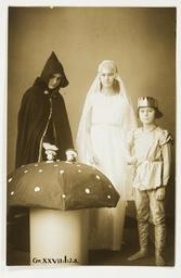 Keywords: Margit och Erik von Geijer samt Elionore Joseph. Erik prins, Margit som fe. Elionore som häxa, 1920 - Hallwylska museet - 107989.tif LSH artwork sv FOTOGRAFIER m m FRÅN JULAFTNAR firade med familjen von Geijer 1 Från år 1913 på Wegeholm Fotografi Av Margit och Erik von Geijer som småbarn I högra nedre hörnet signerat Emil Bruno Hälsingborg Höjd 19 cm; bredd 11 cm Gåva till Wilhelmina von Hallwyl januari eller februari 1914 från hennes dotter Irma 2 Från år 1914 på Wegeholm Julgransflagga svensk Av silkespapper med stång av ståltråd Längs korsets horisontala del med svart bläck skrivet Hopp och Trohet Jul 1914 Längd 13 cm bredd 7 cm Stång längd 12 cm Gåva till Walther von Hallwyl Julaftonen 1914 från hans dotterdotter och dotterson Margit och Erik von Geijer Julgransflagga svensk och två fotografier Flagga Som den nyss beskrivna Fotografier På kort 1 Margit von Geijer som Svea stående med utslaget hår i fotsid vit dräkt med slöja pannband mörkt axelband och sandaler i högra handen Sveriges flagga med stången stödd mot marken i vänstra handen riksskölden med Lilla riksvapnet Tre kronor På kort 2 Erik von Geijer som tomte På båda i högra nedre hörnet signerat Emil Bruno Hälsingborg Kort 1 höjd 17 5 cm bredd 7 5 cm Kort 2 höjd 17 7 cm bredd 7 5 cm Gåva till Wilhelmina von Hallwyl Julaftonen 1914 från hennes dotterdotter och dotterson Margit och Erik von Geijer För beskrivning av julfirandet på Wegeholm se detta inv nummer i katalogverket Flaggorna inköpta av Irma von Geijer hos en handlare i Hälsingborg Fotografierna tagna Januari 1915 hos fotografen Emil Bruno Helsingborg 3 Från år 1915 på Wegeholm Solros Helianthus Av silkespapper och sammet med stjälk av ståltråd Blomkorg av gult kräpperat papper samt brun sammet stjälken lindad med grönt papper med foderblad och tre stjälkblad av dylikt papper Stjälk längd 31 cm Blomma diameter 14 cm Gåva till Walther von Hallwyl Julaftonen 1915 från hans dotterdotter och dotterson Margit och Erik von Geijer Solros Helianthus och två fotografier Solros Som den nyss beskrivna Fotografier På kort 1 Margit och Erik von Geijer stående hand i hand; båda klädda till änglar I högra nedre hörnet signerat Emil Bruno Hälsingborg Höjd 11 8 cm bredd 16 7 cm På kort 2 Samma barn stående i de s k arkaderna framför en dörr på Wegeholms borg samt hållande i dragstången till en blomstersmyckad liten vagn; båda klädda som på kort 1 Gåva till Wilhelmina von Hallwyl f Kempe julaftonen 1915 från Margit och Erik Geijer För detaljer om julfirandet se detta inv nr i katalogverket Fotografierna tagna Februari 1916 av fotografen Emil Bruno Helsingborg 4 Från år 1916 på Wegeholm Docka Lockigt ljusgult hår blåa ögon och röda läppar; clownkostym med bred krage och toppig mössa; på kostymen stora blåa rosetter av silkespapper Längd utan mössa 16 5 cm Mössa höjd 3 8 cm Gåva till Walther von Hallwyl julaftonen 1916 från Margit och Erik von Geijer Docka och fotografi Docka Som den nyss beskrivna Fotografi Margit och Erik von Geijer som Pierrette och Pierrot I högra nedre hörnet signerat Emil Bruno Hälsingborg Höjd 17 9 cm Bredd 12 4 cm Gåva till Wilhelmina von Hallwyl f Kempe Julaftonen 1916 från Margit och Erik von Geijer För detaljer om julfirandet se detta inv nr i katalogverket 5 Från år 1917 i Hamngatan 4 Stockholm Stjärna med spira Stjärna av guldpapper spira av trä Längd 34 5 cm Stjärna diameter 12 cm Spira längd 25 cm Gåva till Walther von Hallwyl Julaftonen 1917 från Margit och Erik von Geijer För detaljer om julfirandet se detta inventarienummer i katalogverket Fotografien tagen Februari 1918 av fotografen Herm Hamnqvist Atelier Bruno Södra Storgatan 3 Helsingborg 6 Från år 1918 i Hamngatan 4 Stockholm Penséer två stycken Av vitt s k engelskt skinn bomullssatin med stjälk av ståltråd Pressade samt handmålade i färger den ena med vit och den andra med gul mitt; stjälkarna gröna lindade med tyg som blommorna vardera med ett grönt stjälkblad Längd omkring 18 cm Gåva till Walther von Hallwyl julaftonen 1918 från Margit och Erik von Geijer Penséer två stycken och fotografi Penséer Som de nyss beskrivna Fotografi Margit och Erik von Geijer stående klädda till penséer Till höger om bilderna signerat Ferd Flodin -19 Höjd 22 8 cm Bredd 14 5 cm Gåva till Wilhelmina von Hallwyl Julaftonen 1918 från Margit och Erik von Geijer Penséerna inköpta av Irma von Geijer hos en handlare i Helsingborg Fotografien tagen 28 December 1918 av fotografen Ferd Flodin Hamngatan 3 A Stockholm 7 Från år 1919 i Hamngatan 4 Stockholm Snöboll Av vit bomullsvadd Oregelbundet klotrund utanpå beströdd med frostliknande silverglitter samt utan snöre Genomskärning omkring 4 cm Gåva till Walther von Hallwyl Julaftonen 1919 från Margit och Erik von Geijer Snöboll och fotografi Snöboll Som den nyss beskrivna Fotografi Margit och Erik von Geijer stående vända halvt åt vänster Den förstnämnda till höger båda i stor rund mössa och lång kappa av vadd med glitter samt vita strumpor; framför figurerna två stora snöbollar I högra nedre hörnet signerat Brink Foto Höjd 16 6 cm Bredd 11 2 cm Gåva till Wilhelmina von Hallwyl f Kempe julaftonen 1919 från Margit Johanna och Erik von Geijer För detaljer om julfirandet se detta inv nr i katalogverket Snöbollarna inköpta av Irma von Geijer i Buttericks Mönsteraffär Stockholm Fotografien tagen Januari 1920 av fotografen Gustaf Brink Ängelholm 8 Från år 1920 i Hamngatan 4 Stockholm Skogstomte I form av en brandgul flugsvamp Av tyg bommullsvadd och trä m m Höjd 10 8 cm Hatt diameter 9 1 cm Fotplatta diameter 5 9 cm Gåva till Walther von Hallwyl Julaftonen 1920 från Margit och Erik von Geijer Skogstomte och fotografi Skogstomte Som den nyss beskrivna men röd med vita plättar på svamphatten på kortet vid högra änden målat ett paket under en drypande lacktång Fotografi Margit och Er