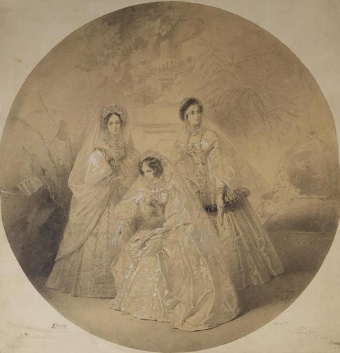 | Keywords: Maria Alexandrovna, Alexandra Fedorovna and Alexandra Iosiphovna by M.Zichy.jpg  Зичи  ихаил Александ ович «По т ет импе ат ицы  а ии Александ овны вдовствующей импе ат ицы Александ ы Федо овны и великой княгини Александ ы Иосифовны» низу сп ава подпись и дата Zichy 1857  ягкий че ный и г афитный ка андаши местами т онут белилами; к уг бумага наклеена на паспа ту 390 х 400 П оисхождение пост в 1928 че ез Г Ф Инв  ОР-38954 Рисунок поступил в Э митаж как по т ет т ех великих княгинь Тем не менее сходство двух пе сонажей с обеими импе ат ицами не вызывает сомнений Ряд обстоятельств позволяет связать  исунок с то жествами сопутствовавшими ко онации импе ато а Александ а II и назвать имя т етьего пе сонажа Как записала в своем дневнике А Ф Тютчева ф ейлина импе ат ицы  а ии Александ овны на п отяжении нескольких дней 2 3 9 сентяб я 1856 г в К емлевском дво це в  оскве уст аивались п идво ные маска ады и балы на кото ых п исутствовали и высочайшие особы 3 сентяб я 1856 г состоялся на одный бал куда допускались все классы общества и кото ый почтили своим п исутствием импе ат ица великие князья и княжны Там же была и великая княгиня Александ а Иосифовна в костюме наполовину польском ото оченном мехом оттенявшем по азительно ее к асоту Тютчева 2000 с 262 Таким об азом  ешается имя т етьего пе сонажа по т ета  это великая княгиня Александ а Иосифовна жена великого князя Константина  иколаевича Возможно Зичи по долгу службы за исовывавший п идво ные события сделал  яд п едва ительных наб осков по кото ым в 1857 г сочинил и эту композицию http //www hermitagemuseum org/wps/portal/hermitage/digital-collection/02 +Drawings/443686/ lng ru 1857 Зичи  ихаил Александ ович Portrait drawings by Mihály Zichy Files uploaded by Shakko from various sources Portraits of Maria Alexandrovna Marie of Hesse Zi Alexandra Feodorovna Charlotte of Prussia in portraits Y Alexandra Iosifovna of Altenburg in portraits Family portraits of Russian rulers Painted portraits in female court uniforms and dress of Russia Imperial portrait drawings in the Hermitage Drawings in the Hermitage PD-Art |