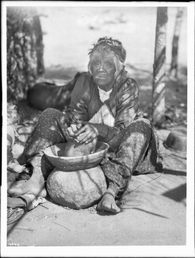| Keywords: Maria Casseri, a Coahuilla Indian woman, grinding mesquite beans for flour on a stone metate with a basket top, California, ca.1899 (CHS-4746).jpg  en <br> Maria Casseri a Coahuilla Indian woman grinding mesquite beans for flour on a stone metate with a basket top California ca 1899 Photograph of a Maria Casseri a Coahuilla Indian woman grinding mesquite beans for flour on a stone metate with a basket top California ca 1899 She can be seen seated on a blanket on the ground with the grinding stone between her ankles She wears a long-sleeved sweater with a white shirt underneath and printed pants She has short white hair wrapped with a headband A dog and other items can be seen behind her Call number CHS-4746 Photographer James George Wharton Filename CHS-4746 Coverage date circa 1899 Part of collection California Historical Society Collection 1860-1960 Format glass plate negatives Type images Part of subcollection Title Insurance and Trust and C C Pierce Photography Collection 1860-1960 Repository name USC Libraries Special Collections Accession number 4746 Microfiche number 1-172- Archival file chs_Volume98/CHS-4746 tiff Repository address Doheny Memorial Library Los Angeles CA 90089-0189 Geographic subject country USA Format aacr2 3 photograph glass photonegative photoprints b w ; 22 x 17 cm 21 x 26 cm Rights Digitally reproduced by the USC Digital Library; From the California Historical Society Collection at the University of Southern California Subject adlf tribal areas Project USC Repository email specol usc edu Identifying number unidentified no James-2010 Contributing entity California Historical Society Date created circa 1899 Publisher of the digital version University of Southern California Libraries Format aat photographic prints; photographs Geographic subject state California Legacy record ID chs-m17055; USC-1-1-1-13920 Access conditions Send requests to address or e-mail given Phone 213 821-2366; fax 213 740-2343 Subject file heading Indians -- Mission -- Cahuilla Subject lcsh Indians of North America; Cahuilla Indians Subject Mission Indians; Cahuilla Indians; Casseri Maria; Coahuilla Indians; Mission Indians circa 1899 date created James George Wharton http //digitallibrary usc edu/cdm/ref/collection/p15799coll65/id/17068 PD-old-70-1923 Images from USC Digital Library uploaded by Fæ California Historical Society Collection 1860-1960 Glass plate negatives Cahuilla Cahuilla baskets Photographs by George Wharton James Prosopis |