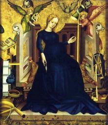 Keywords: Maria gravida, or Mary at the Spinning Wheel from Németújvár (c.1410, Hungarian gallery).jpg Maria gravida or Mary at the Spinning Wheel from Németújvár C 1410 Tempera Wood 89 × 78 cm Inv 52 656 Location Hungarian National gallery Painted around 1410 this panel of the Madonna originally from Németújvár today Güssing Austria is one of the most valued treasures in the collection The altar painting had a horizontal format before the left side was lopped off This part of the painting had shown an angel appearing before the slumbering St Joseph in order to dispel his doubts The bit of green wing and red clothes the straw hat tied to a stick and the small cask of water in the left of the painting all clearly refer to this episode In the center of the image we see the Virgin in the company of two angels as she spins her right hand holds a spindle while her left hand guides the yarn Next to her is the spinning wheel The Holy Spirit in the form of a dove hovers by her gold halo The archangel Gabriel's words of welcome spoken at the time of the Annunciation can be read in Gothic minuscule in the book on the bookstand Ave gratia plena Dominus tecum or Hail full of grace the Lord is with you The folds of Mary's long blue dress and the handling of the light make it clear that Mary is expecting Infrared photos of the painting show that under Mary's clothes the master had sketched the child in her belly Curled up in the fetal position the tiny Jesus was surrounded by two halos with a cross on his shoulder referring to the Passion http //www mng hu/en/collections/allando/180/oldal 2/947 1410 anonymous Maria gravida spinning Files uploaded by Shakko from various sources Gothic paintings of Virgin Mary 1410s paintings Religious paintings in the Hungarian National Gallery Paintings of Virgin Mary in Hungary Güssing PD-old