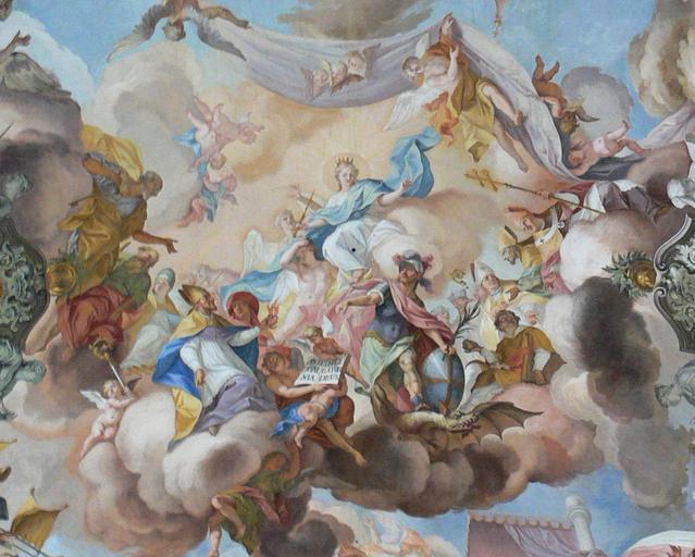 Keywords: Marienmünster Dießen Langhausfresko detail 3.jpg Marienmünster Dießen ehem Augustiner-Chorherren-Kirche Mariä Himmelfahrt heute Pfarrkirche Dießen am Ammersee <br /><br /> Fresko über dem Chor bzw Altarraum von Johann Georg Bergmüller 1736 Maria als Himmelskönigin verehrt von den Schutzpatronen der Dießener Klöster Hl Augustinus von Hippo Hl Georg Hl Stephanus Hl Martin von Tours Hl Petrus und Hl Paulus Creator Johann Georg Bergmüller own 2008-04 Photo Andreas Praefcke Own work all rights released Public domain Vaults of Marienmünster Dießen Frescos of Marienmünster Dießen |