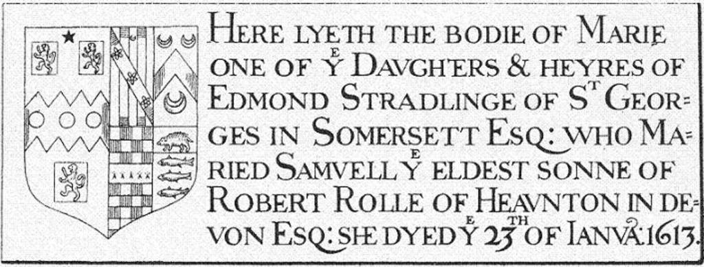 Keywords: MarieRolleBrass StStephensBySaltash 1613.jpg en Monumental brass of Marie Stradling d 1613 a daughter of Edmond Stradling of St George's Somerset a member of the Stradling family of St Donat's Castle Glamorgan and wife of Sir Samuel I Rolle c 1588-1647 of Heanton Satchville Petrockstowe Devon Member of Parliament for Callington Cornwall in 1640 and for Devon 1641-1647 Church of St Stephen-by-Saltash Cornwall affixed to wall at east end of north aisle formerly on floor by altar Inscription Here lyeth the bodie of Marie one of ye daughters heyres of Edmond Stradlinge of St Georges in Somersett Esq who maried Samuell ye eldest sonne of Robert Rolle of Heaunton in Devon Esq She dyed yr 23th of Janua 1613 Armorials Or on a fesse dancetté between three billets azure each charged with a lion rampant of the first three bezants a mullet for difference Rolle impaling quarterly 1 Paly of six shown here incorrectly as five argent and azure on a bend gules three cinquefoils or Stradling ; 2 Azure a chevron between three crescents or Berkerolles of Coity Castle Glamorgan; 3 Chequy and a fess ermine Turberville of Coity Castle ; 4 three fishes niant in pale on a chief a hedgehog Dunkin p 90 Dunkin Edwin Hadlow Wise The Monumental Brasses of Cornwall with Descriptive Geneaological and Heraldic Notes 1882 plate LXI Drawn by Dunkin Edwin Hadlow Wise 1882 File MarieRolleBrass StStephensBySaltash 1613 Detail jpg St Stephen's Church Saltash Monumental brasses in Cornwall PD-old-100 |