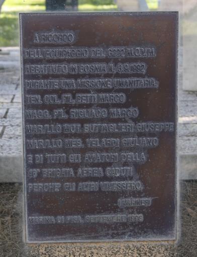 | Keywords: Marina di Pisa monument G-222 downed in Bosnia 04.JPG  en ITA Tuscany Marina di Pisa Via Inghirami The memorial monument to the crew of the Italian Air Force Aeritalia G 222 Aeritalia G 222TCM MM62113 downed in Bosnia The plane on September 3 1992 during a relief flight n 2117 on behalf of the United Nations carrying five tons of blankets departed from Split Airport to Sarajevo Airport was shot down by a Stinger missile At 11 26 GMT any contact with the plane went lost Two CH-53 rescue helicopters reached the crash site near the town of Jasenj 34 km from Sarajevo some time after they were forced to end the mission because of arms fire The Italian crew was composed of Lieutenant Colonel Pilot Betti Marco Major Pilot Rigliaco Marco Marshal Buttaglieri Giuseppe and Marshal Velardi Giuliano own Piergiuliano Chesi 2013-03-16 Marina di Pisa Aeronautica Militare Plaques to aviators in Italy |