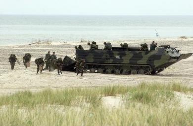Keywords: Marines disembark from an amphibious landing craft.jpg en Marines from Denmark Lithuania Poland and United States disembark from an PTS-2 amphibious landing craft during an exercise at Ustka Poland as part of Baltops 2003 The United States and 11 other nations are participating in this year's exercise BALTOPS 2003 is intended to improve interoperability between allies and Partnership for Peace countries by conducting a peace support operation at sea including exercises in gunnery replenishment-at-sea undersea warfare radar tracking mine countermeasures seamanship search and rescue maritime interdiction operations and scenarios dealing with potentially real world crises http //www navy mil; http //www navy mil/view_image asp id 7972 exact source U S Navy photo by Photographer ™s Mate 1st Class Chadwick Vann 2003-06-12 PD-USGov-Military-Navy PTS-2 Amphibious warfare BALTOPS in Ustka BALTOPS 2003 |