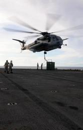 Keywords: Marines Load and Go DVIDS217729.jpg en Sailors attach a palcon filled with two tents to a single-point hook system on a CH-53E Super Stallion helicopter assigned to Iron Horse of Marine Heavy Helicopter Squadron 461 during external training the lifting and transport of external cargo on the flight deck of the multipurpose amphibious assault ship USS Wasp Wasp is currently deployed on Southern Partnership Station-Amphib with Destroyer Squadron 40 and a Security Cooperation Marine Air-Ground Task Force embarked Southern Partnership Station is part of the Partnership of the Americas Maritime Strategy that focuses on building interoperability and cooperation in the region to meet common challenges 2009-10-21 Petty Officer 3rd Class David Smart https //www dvidshub net/image/217729 091021-N-+++++-028 2009-10-27 21 46 USS WASP AT SEA PD-USGov-Military-Navy Sikorsky CH-53E Super Stallion Images from DoD uploaded by Fæ |