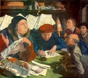 | Keywords: Marinus van Reymerswale - The Tax Collector - WGA19329.jpg Artwork Creator Marinus van Reymerswale 1542 Oil on panel size cm 104 120 Institution Alte Pinakothek object history credit line accession number WGA link 19329 http //www wga hu/art/r/reymersw/tax_coll jpg http //www wga hu/html/r/reymersw/tax_coll html painting genre Flemish 1501-1550 PD-old-100 Marinus van Reymerswale Dutch paintings in the Alte Pinakothek Paintings in the Alte Pinakothek flat list 1542 paintings WGA form painting WGA type genre WGA School Flemish WGA time period 1501-1550 17th-century oil on canvas paintings in Germany 17th-century paintings in the Alte Pinakothek 1540s paintings in Bavaria People with money in art Coins in art Males writing in art Quills in art Paintings by Marinus van Reymerswale with fur Male fur clothing in art Marten clothing in art |