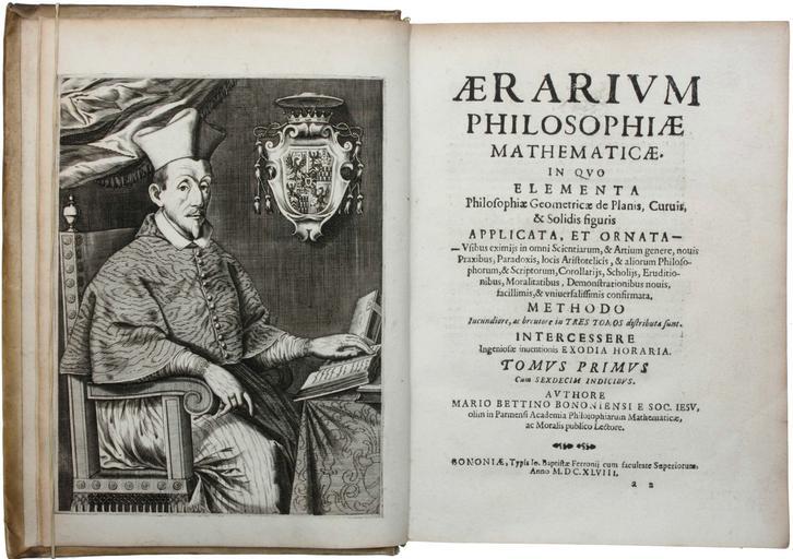 Keywords: Mario Bettinus.jpg en Mario Bettini 1582-1657; BETTINUS Marius Aerarium Philosophiae Mathematicae In Quo Elementa Philosophiae Geometricae de Planis Curvis Solidis figuris Applicata Et Ornata Usibus eximiis in omni Scientiarum Artium genere novis Praxibus Paradoxis locis Aristotelicis aliorum Philosophorum Scriptorum Corollariis Scholiis Eruditionibus Moralitatibus Demonstrationibus novis facillimis universalissimis confirmata Methodo Iucundiore ac breviore in Tres Tomos distributa sunt Intercessere Ingeniosae inventionis Exodia Horaria 3 In Quo Reliqui quatuor libri elementares de planis applicati c Epilogus Planimetricus Breviarium speculativum practicum de curvis solidis cum facillimis ac novis demonstrationibus Materiae plurium Tomorum indicatae Cum Indicibus viginti communibus Secundo et Tertio huic Tomo Bologna G B Ferroni 1648 First edition http //www sophiararebooks com/store/2435 htm Mario Bettinus 1648 Mario Bettinus2 jpg PD-old-100 Mathematicians from Italy |