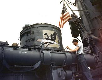 Keywords: Mark 15 torpedo tube mount aboard a Fletcher-class destroyer c1943.jpg View of a Mark 15 torpedo tube mount aboard a U S Navy Fletcher-class destroyer showing a personal insignia on the cupola corc ain the autumn of 1943 The destroyer is probably USS O'Bannon DD-450 Official U S Navy photo https //www history navy mil/our-collections/photography/numerical-list-of-images/nhhc-series/nh-series/80-G-K-03000/80-G-K-3977 html 80-G-K-3977 from the U S Navy http //www history navy mil Naval History and Heritage Command autumn 1943 U S Navy PD-USGov-Military-Navy USS O'Bannon DD-450 Mark 15 torpedo World War II color photographs of the Pacific War in 1943 |