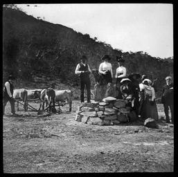 Keywords: rahs bullocks cairns excursions historic sites historicsites historical costumes historicalcostumes monuments memorials people ploughing tree stumps treestumps monochrome blackandwhite outdoor photo border black and white Stump of tree at Mount Blaxland, claimed to have been marked by Blaxland, Lawson and Wentworth on crossing the Blue Mountains in 1813. Show group of unidentified men and women gathered on and around a cairn of stones formed around base of tree. Unidentified man in formal clothing to left ploughing with team of bullocks. From negative in Mitchell Library Frank Walker Collection ON 150, Item 1019 Stump of tree at Mount Blaxland, claimed to have been marked by Blaxland, Lawson and Wentworth on crossing the Blue Mountains in 1813. Show group of unidentified men and women gathered on and around a cairn of stones formed around base of tree. Unidentified man in formal clothing to left ploughing with team of bullocks. From negative in Mitchell Library Frank Walker Collection ON 150, Item 1019
