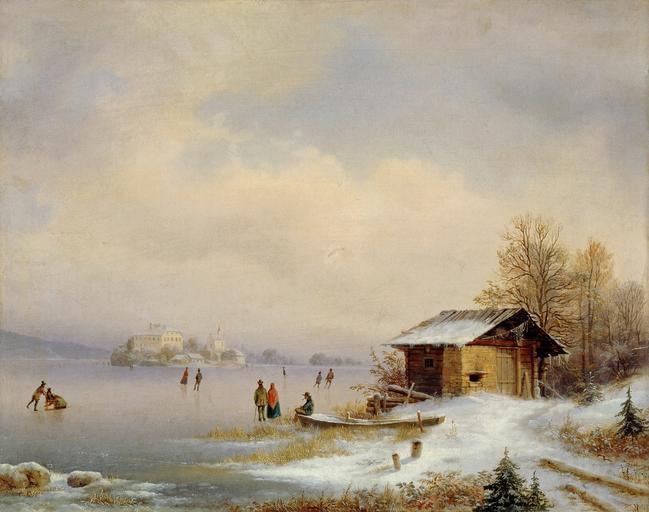 Keywords: marko pernhart painting oil on canvas artistic nature outside sky clouds landscape country countryside winter snow ice people buildings skating castle
