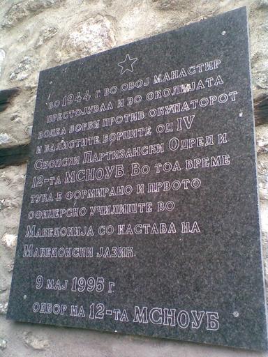 | Keywords: Markov manastir plocha.JPG A National Liberation War commemoration sign in Markov Manastir near Skopje Republic of Macedonia Own 2008-03-25 Revizionist Cyrillic inscriptions Marko's Monastery Monuments in Skopje Macedonian inscriptions Plaques in the Republic of Macedonia |