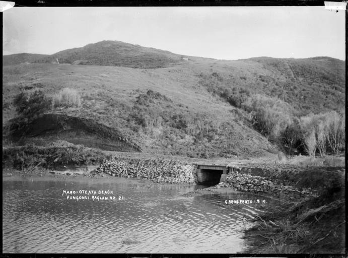 | Keywords: blackandwhite monochrome photo border outdoor black and white Maro-Oteata Beach, Ponganui, Raglan area. View looking over the bay, towards a road and bridge without sides across a stream. There is a grassy slope behind with a horse grazing near the top. Taken 1 August 1910 by 'G Bros', probably Gilmour Brothers of Raglan. Name given as Pangonui in several images taken by the Gilmour Brothers, but given as Ponganui in recent maps. Inscriptions: Inscribed - Photographer's title on negative -bottom left: Maro-Oteata Beach. Pangonui, Raglan N.Z. 211.bottom right: G. Bros. Protd. 1.8.10.. Quantity: 1 b&w original negative(s). Physical Description: Dry plate glass negative 4.5 x 6.5 inches Gilmour Brothers (Firm). Maro-Oteata Beach, Ponganui, in the vicinity of Raglan, 1910 - Photograph taken by Gilmour Brothers. Price, William Archer, 1866-1948 :Collection of post card negatives. Ref: 1/2-001052-G. Alexander Turnbull Library, Wellington, New Zealand. natlib.govt.nz/records/22841065 Maro-Oteata Beach, Ponganui, Raglan area. View looking over the bay, towards a road and bridge without sides across a stream. There is a grassy slope behind with a horse grazing near the top. Taken 1 August 1910 by 'G Bros', probably Gilmour Brothers of Raglan. Name given as Pangonui in several images taken by the Gilmour Brothers, but given as Ponganui in recent maps. Inscriptions: Inscribed - Photographer's title on negative -bottom left: Maro-Oteata Beach. Pangonui, Raglan N.Z. 211.bottom right: G. Bros. Protd. 1.8.10.. Quantity: 1 b&w original negative(s). Physical Description: Dry plate glass negative 4.5 x 6.5 inches Gilmour Brothers (Firm). Maro-Oteata Beach, Ponganui, in the vicinity of Raglan, 1910 - Photograph taken by Gilmour Brothers. Price, William Archer, 1866-1948 :Collection of post card negatives. Ref: 1/2-001052-G. Alexander Turnbull Library, Wellington, New Zealand. natlib.govt.nz/records/22841065 |