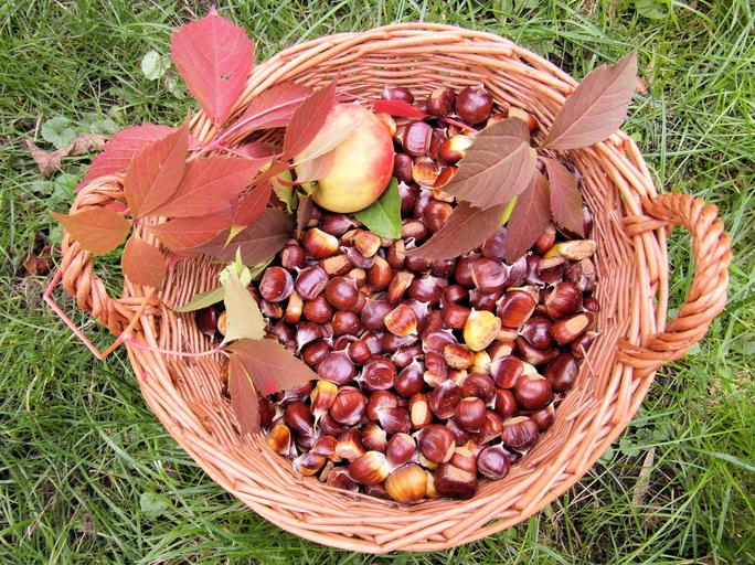 Keywords: maroni fall autumn sweet chestnuts autumn fruits basket decoration vine colorful red color palatinate odenwald