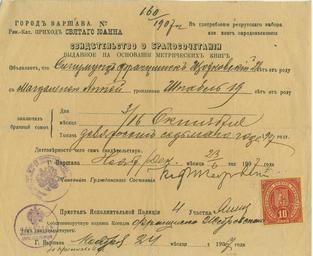 | Keywords: Marriage certificate-1907.jpg  Marriage certificate 1907 Original document in Russian language dated using both Old Style and New Style dates in Warsaw then part of Russian Empire Certificate dated November/December 23/6 1907; the marriage dated October 3/16 1907 Świadectwo ślubu z 1907 Oryginalny dokument w języku rosyjskim datowany przy użyciu obu dat nowego i starego porządku w Warszawie była częścią Imperium Rosyjskiego Świadectwo z 23 6 listopada grudnia 1907 data małżeństwa 3 16 października 1907 Свидетельство о б акосочетании 1907 Выдано в Ва шаве относившейся тогда к Российской Импе ии на  усском языке и дати овано как по ста ому так и по новому стилю б акосочетание 3 16 октяб я 1907 выдача свидетельства 23 нояб я 6 декаб я 1907 Le certificat de mariage 1907 Le premier document utilisant en Russe le vieux style et les nouvelles style de dates à Varsovie il faisait partie de l'empire Russe Le certificat est daté 23/6 novembre/décembre 1907 et le mariage est daté 3/16 octobre 1907 Transcription ГОРОДЪ ВАРШАВА  160/1907г Рим -Кат ПРИХОДЪ СВЯТАГО ІОА  А Въ упот ебленіе  ек утскаго набо а или книгъ на одонаселенія СВИДѢТЕЛЬСТВО О БРАКОСОЧЕТА ІИ ВЫДА  ОЕ  А ОС ОВА ІИ  ЕТРИЧЕСКИХЪ К ИГЪ Объявляетъ что Сигизмундъ Ф анцишекъ Щотковскій 28 лѣтъ отъ  оду съ  агдаленою Анной у ожденною Шнабль 19 лѣтъ отъ  оду заключилъ б ачный союзъ Дня 3/16 мѣсяца Октяб я Тысяча девятьсотъ седьмаго года 1907 года Достовѣ ность чего симъ свидѣтельствую Г Ва шава  ояб /Дек мѣсяца 23/6 дня 1907 года Чиновникъ Г ажданскаго Состоянія Кефисефский ЧИ ГРАЖД СОСТ ПРИХ СВ ІОА  А ВЪ ВАРШАВѢ URZĄD ST CYW PARAF S<sup><u>go</u></sup> JANA W WARSZAWIE ВАРШАВСКАГО ГОРОД УПРАВЛЕ ІЯ 10 КОП П иставъ Исполнительной Полиціи 4 Участка Собственно учную подпись Ксендза Ф анциска Жеб овскаго симъ свидѣтельствуетъ П иставъ 4 БѢЛЯ СК У-А ВАРШ ИСП ПОЛИЦІИ Г Ва шава  ояб я 24 мѣсяца _ д 1907 года за п истава 4 уч Marriage certificates 1907 documents 16 October 6 December Cyrillic writing Zygmunt Szczotkowski Documents in Russian  |