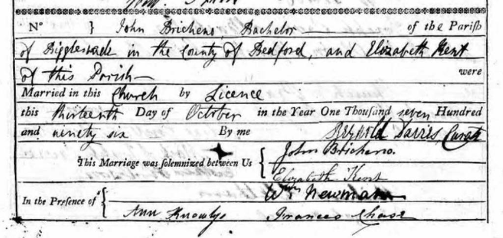 | Keywords: Marriage Certificate John Bricheno 1796.jpg en Marriage certificate of John Bricheno and Elizabeth Kent in 1796 He was the owner of Shortmead House Biggleswade Register of Biggleswade Church Bedfordshire 1796 author 1796 Biggleswade PD-old-100-1923 |