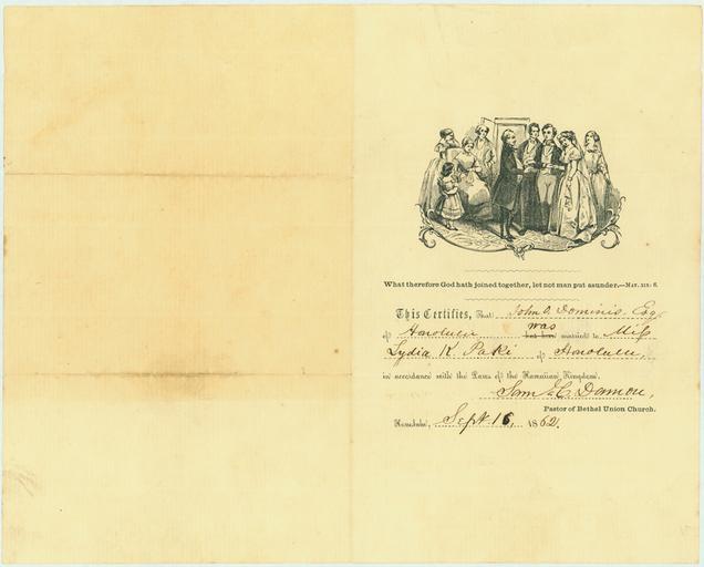 | Keywords: Marriage Certificate of John Owen Dominis and Lydia K. Paki.jpg en Marriage Certificate of John Owen Dominis and Lydia K Paki 16 September 1862 http //nutfieldgenealogy blogspot com/2010/12/wedding-wednesday-another-royal-wedding html; Bishop Museum Archives Kingdom of Hawaii 1862-09-16 PD-old-100 John Owen Dominis Liliuokalani Marriage certificates | ||||