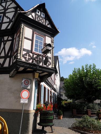 Keywords: MartinsthalHauptstrHotelZurKroneErker.JPG de Fachwerkerker am Hotel zur Krone in der Ortsmitte von Martinsthal im Rheingau own Brühl 2009-09-06 Hauptstraße 27 Martinsthal