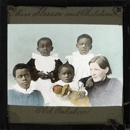 Keywords: Mary Slessor and Four Children, Old Calabar, late 19th century (imp-cswc-GB-237-CSWC47-LS2-036).jpg en <br> Mary Slessor and Four Children Old Calabar late 19th century Mary Slessor pictured with four young girls All four children are dressed in western style clothing and the youngest child in the foreground of the picture is holding a knitted doll ; Mary Slessor was a Scottish missionary known for her work in Africa and here she adopted abandoned children most notably twin babies and the children of slaves The four children in this image Janie Alice Maggie and Mary travelled to Scotland with Mary on a return visit home as she was afraid to leave them unprotected in Calabar Photographer Unknown Subject personal name Slessor Mary Mitchell 1848-1915 Filename imp-cswc-GB-237-CSWC47-LS2-036 tif Coverage date before 1915 Part of collection International Mission Photography Archive ca 1860-ca 1960 Type images Part of subcollection Photographs from the Centre for the Study of World Christianity University of Edinburgh U K ca 1900-ca 1940s Repository name Centre for the Study of World Christianity Archival file impaunpub_Volume7/1310 url Repository address The University of Edinburgh School of Divinity New College Mound Place Edinburgh EH1 2LX United Kingdom Geographic subject country Nigeria Format aacr2 1 lantern slide 8 x 8 cm Geographic subject continent Africa Rights Contact the repository for details Part of series Mary Slessor LS2 Repository email divinity-CSWC ed ac uk Subject lcsh Keyword Adopted children; Population Date created circa 1880 Publisher of the digital version University of Southern California Libraries Subject aat genre group portraits Format aat lantern slides Legacy record ID impa-m68180 Access conditions http //www ed ac uk/schools-departments/divinity/research/centres/world-christianity/collections-resources File GB 237 CSWC47/LS2/36 1880 author http //digitallibrary usc edu/cdm/ref/collection/p15799coll123/id/64432 PD-old-70-1923 Magic lantern images Images from USC Digital Library uploaded by Fæ International Mission Photography Archive ca 1860-ca 1960 Adoption Calabar |