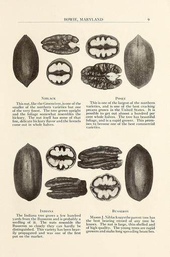 | Keywords: Maryland Nut Nurseries, Bowie, Maryland (16456049534).jpg BOWIE MARYLAND <br> N I BLACK <br> This nut like the Greenriver is one of the <br> smaller of the northern varieties but one <br> of the very finest The tree grows upright <br> and the foliage somewhat resembles the <br> hickory The nut itself has some of that <br> fine delicate hickory flavor and the kernels <br> come out in whole halves <br> Posey <br> This is one of the largest of the northern <br> varieties and is one of the best cracking <br> pecans grown in the United States It is <br> possible to get out almost a hundred per <br> cent whole halves The tree has beautiful <br> foliage and is a rapid grower This prom- <br> ises to become one of the best commercial <br> varieties <br> Indiana <br> The Indiana tree grows a few hundred <br> yards from the Busseron and is probably a <br> seedling of it The nuts resemble the <br> Busseron so closely they can hardly be <br> distinguished This variety has been heav- <br> ily propagated and was one of the first <br> put on the market <br> Busseron <br> Mason J Niblack says the parent tree has <br> the best bearing record of any tree he <br> knows The nut is large thin-shelled and <br> of high quality The young trees are rapid <br> growers and make long spreading branches 43826235 149287 78056 Page 9 Text http //www biodiversitylibrary org/page/43826235 ca 1917 10 5962/bhl title 78056 Henry G Gilbert Nursery and Seed Trade Catalog Collection ; Maryland Nut Nurseries Biodiversity Heritage Library Maryland Nut Nurseries Bowie Maryland Bowie Catalogs Maryland Nurseries Horticulture Nut trees U S Department of Agriculture National Agricultural Library bhl page 43826235 dc identifier http //biodiversitylibrary org/page/43826235 bhlGardenStories nurseries horticulture u s department of agriculture national agricultural library bhlgardenstories Information field Flickr posted date ISOdate 2015-04-08 CC-BY-2 0 BioDivLibrary https //flickr com/photos/61021753 N02/16456049534 2015-08-23 19 51 02 cc-by-2 0 PD-old-70-1923 Maryland Nut Nurseries Bowie Maryland Photos uploaded from Flickr by Fæ using a script |