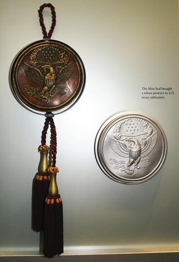 | Keywords: MasiTreatySealPendant.jpg The Masi or Treaty Seal the variant of the Great Seal of the United States used specifically on treaties for several decades in the 1800s designed by Seraphim Masi and quite different than the design then and now in use These pendant seals attached to the documents via strings were transported in metal boxes called skippets The skippets an example of which is on the right also had an impression of the seal Both this wax disc and skippet were made from a mold by Samuel Lewis who was contracted to make skippets starting in about 1854 His design was a nearly exact copy of the original Masi die with slight differences on the top of the eagle's head being the most apparent difference In 1871 at least one of the wax seals made from the Lewis mold was actually used on a treaty most even in 1871 were made using the original Masi die Extracted from PDF version of http //diplomacy state gov/exhibitions/onlineexhibitions/100935 htm Using the Great Seal as the Nation Expands poster part of a U S Diplomacy Center State Department exhibition on the 225th anniversary of the Great Seal Direct PDF URL http //diplomacy state gov/documents/organization/101215 pdf 21MB U S Government The http //diplomacy state gov/exhibitions/onlineexhibitions/100935 htm U S Diplomacy Center exhibition page states All materials in this exhibition are in the public domain and can be reproduced without permission Citation of this source is appreciated PD-USGov Great Seal of the United States Skippets Seraphim Masi |
