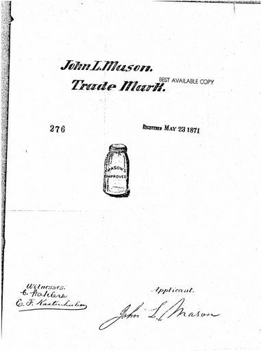 | Keywords: Masons Improves jars Trademark No 276.jpg  en John L Mason's May 23 1871 United States trademark registration 1871-05-23 USPTO TSDR database United States other versions PD-USGov Mason jars Trademarks Uploaded with UploadWizard Uploaded with UploadWizard |