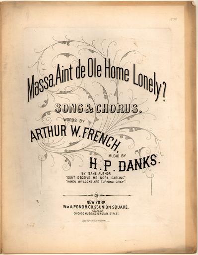 | Keywords: MassaAintDeOleHomeLonelyCover.jpeg Massa Ain't de Ole Home Lonely sheet music cover 1875 Sheet music published in 1875 by William A Pond via http //scriptorium lib duke edu/sheetmusic/b/b07/b0704/ 1875 Note Cover reads 1879 but inside cover clearly reads 1875 which is also the date per Library of Congress Words by Arthur W French Music by H P Danks Cover engraved by Clayton Copyright by H P Danks Hart Pease Danks died 1903 ; copyright expired PD-Old Music in 1875 Sheet music covers of New York City |