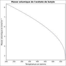 | Keywords: Masse volumique acétate de butyle.svg fr Masse volumique calculée d'après <br/> Robert H Perry et Donald W Green Perry's Chemical Engineers' Handbook McGraw-Hill USA 1997 7e éd 2400 p ISBN 0-07-049841-5 p 2-94 own Epop 2010-06-27 Created with Gnumeric Density curves |