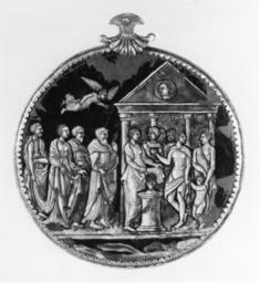 | Keywords: Master KIP - A Roman Sacrifice - Walters 44147.jpg  Ten persons and a child are gathered around the flame burning on a round altar They are in front of a temple with the strange ornament of a profile head in a circular frame set as an imago clipeata in the pediment Above on the left is a flying Victory middle Other date century 16 technique painted enamel copper Diam cm 9 1 accession number 44 147 18950 William T / Henry Walters Collection Baltimore date and mode of acquisition unknown Walters Art Museum Henry Walters Acquired by William T or Henry Walters Exposition Universelle Paris 1900 place of origin Limoges France Walters Art Museum license Limoges painted enamels in the Walters Art Museum Master KIP Media contributed by the Walters Art Museum needs category review Painted enamel art in the Walters Art Museum |