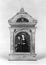 Keywords: Master of the Large Foreheads - Virgin and Child - Walters 44216.jpg The Virgin wears a diadem and is dressed in a blue robe and a purple mantle The child Christ wears a long green robe The group is seated on a low bench resting on a tiled floor At an early date this plaque was exported to northern Italy where it was set in a nielloed gilt-metal frame God the Father appears in the nielloed plaque of the small tympanum and the band underneath is inscribed in niello PAX VOBIS The frame is decorated with acroteria thorny acanthus leaves egg-and-dart dentils cherubs' heads palmettes and flanked by two pilasters their capitals adorned with acanthus leaves and two rosettes their shafts with elongated leafy motifs early Other date century 16 painted enamel on copper with silver niello frame Pax cm 17 9 ; Plaque cm 6 7 5 accession number 44 216 18646 Valerio Collection Sale Paris December 18 1893 Jacques Seligmann Paris date and mode of acquisition unknown Henry Walters city Baltimore Walters Art Museum Henry Walters Acquired by Henry Walters 1911 place of origin northern Italy Walters Art Museum license Limoges painted enamels in the Walters Art Museum Master of the Large Foreheads Madonna and Child Media contributed by the Walters Art Museum needs artist review Painted enamel art in the Walters Art Museum Pax tablets |