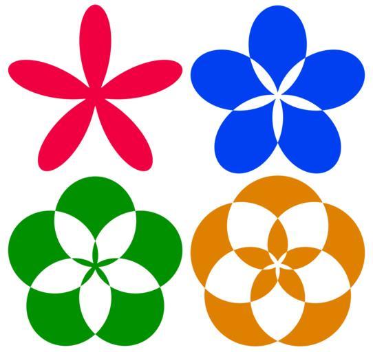 Keywords: Mathematical-polar-equation-flowers.svg Mathematical based floral ornaments derived from the polar coordinates equation r b+sin aθ which is a slight generalization of the Limaçon and Rose curves Top left curve with a 5 and b 1 25 non-self-intersecting Top right curve with a 5/2 and b 1 08 single-level self-intersecting Bottom left curve with a 5/3 and b 1 08 two-level self-intersecting Bottom right curve with a 5/4 and b 1 08 three-level self-intersecting The self-intersecting curves are displayed with even-odd fill algorithm For other patterns made with the quasi-Limaçon/Rose equation r b+sin aθ see File Interlaced-Triangles Brunnian-link alternate svg and File Quinquetra-interlaced-alternate svg For other abstract symmetrical floral ornaments see Image Retro-flower-ornaments svg and Image Five petal flower icon svg Self-made image converted from the following four-page vector PostScript source code <pre> /A 300 396 translate 75 dup scale def/w d mul res div/th exch def th 5 mul d div/x exch def x sin ecc add th cos mul x sin ecc add th sin mul def/B 0 w moveto 1 1 360 res mul w lineto for closepath def A/d 1 def/ecc 1 25 def/res 5 def B fill showpage A/d 2 def -18 rotate/ecc 1 08 def B eofill showpage A/d 3 def 36 rotate B eofill showpage A/d 4 def 18 rotate B eofill showpage EOF</pre> 2009 AnonMoos SVG flower icons Mathematical art Graphic ornaments with transparent background Plane algebraic curves Images with PostScript source code Blue green red yellow |
