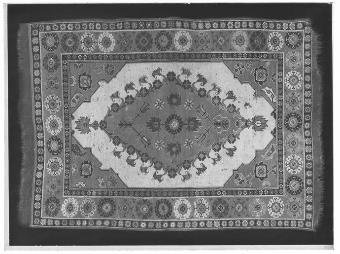 | Keywords: Matta från ushak-området, s.k. Siebenburgermatta - Skoklosters slott - 68763-negative.tif LSH artwork sv I mittfältet blommor bl a tulpaner sammanställda i en romb i gult blått och grönt mot röd botten avtecknande sig mot ett mörkblått fält <br/>I hörnfälten närmast bården blommor och symboliska figurer mot röd botten <br/>Bård med rosetter i gult vitt blått grönt och svart mot röd botten <br/>På kortsidorna smalt avslutningsparti i gult utan knutar <br/>Ghiordesknutar <br/>Turkiet Ushak 1600- talet original caption century 17 size mm 1060 1540 SKO Dröm och verklighet - Orienten på Skokloster 2001 Skoklosters slott Transylvania and the Art of Ottoman Turkish Carpets Ny prel tid 2015 Budapest Museum of Applied Arts place of origin original filename LN_A02778_002778 23083 inventory number SKO 1835 68763 CC0 Matta från ushak-området s k Siebenburgermatta - Skoklosters slott - 68763 tif Uncategorized 2015 March 5 |