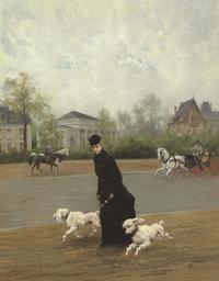 | Keywords: Maurice Poirson - Elegante au Bois de Bologne (1877).jpg Maurice Poirson 1850-1882 circa 1877 oil canvas cm 81 9 64 8 accession number object history credit line exhibition history MPoirson 1877 ~ lr signature / date christies online 5211677 2175 146 New York 4 June 2009 PD-old-100-1923 DEFAULTSORT Poirson Maurice; Genre 1877; Christie ™s 2009 Maurice Poirson 1870s genre paintings Paintings of dogs People with dogs | ||||