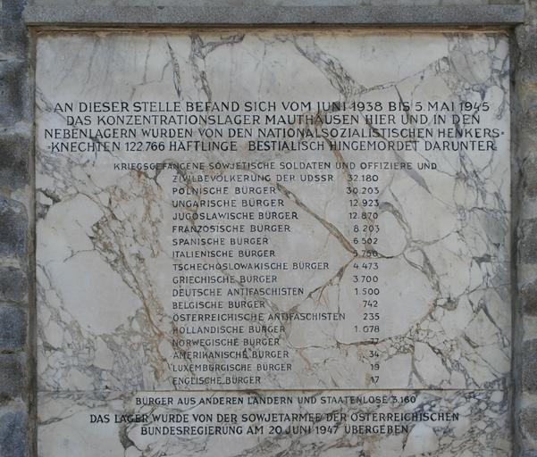 | Keywords: Mauthausen-tablet.jpg This tablet is installed on the outer Mauthausen camp wall to the right of the camp gates I am not sure who put the tablet up own photo 2005-08-30 Photographed by Matthew Cudmore Crop and Perspective Maros M r a z Maros Translation The concentration camp of Mauthausen was located at this site from June 1938 to 5 May 1945 Here and in its sub-camps 122 766 prisoners were horrendously murdered by Nazi executioners They include Soviet soldiers and officers and civilians from the USSR 32 180 Polish citizens 30 203 Hungarian citizens 12 923 Yugoslav citizens 12 870 French citizens 8 203 Spanish citizens 6 502 Italian citizens 5 750 Czechoslovak citizens 4 473 Greek citizens 3 700 German anti-Fascists 1 500 Belgian citizens 742 Austrian anti-Fascists 235 Dutch citizens 1 078 Norwegian citizens 77 American citizens 34 Luxembourgish citizens 19 English citizens 17 Citizens of other nations and stateless people 3 160 The camp was transferred by the Soviet Army to the Federal Government of Austria on 20 June 1947 Note this German term for executioner is more derogatory than the English term translation by en User Valentinian Matt c j486 Original upload log page en wikipedia Mauthausen-tablet jpg 2005-12-13 05 52 Matt c j486 3456×2304× 3628768 bytes <nowiki>Photographed by Matthew Cudmore Taken August 30 2005 This tablet is installed on the outer camp wall to the right of the camp gates It breaks the number of prisoners down by ethnicity and also whether the victims were soldiers or otherwise I can't re</nowiki> Mauthausen-Gusen memorials |