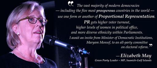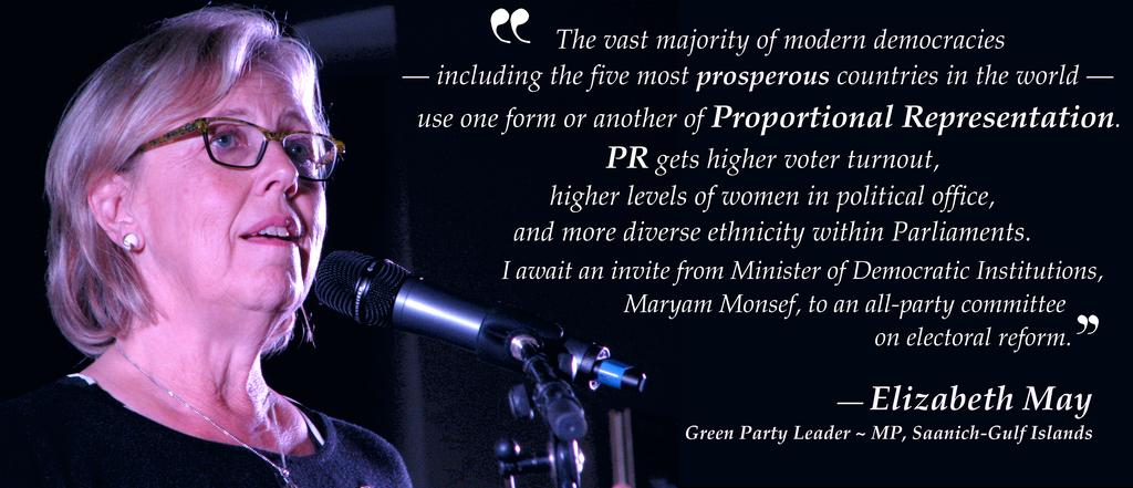 Keywords: people “The vast majority of modern democracies – including the five most prosperous countries in the world – use one form or another of proportional representation. PR gets higher voter turnout, higher levels of women in political office, and more diverse ethnicity within Parliaments. I await an invite from Minister of Democratic Institutions Maryam Monsef to an all-party committee on electoral reform.” —Elizabeth May Green Party Leader MP, Saanich-Gulf Islands "Canadians want Proportional Representation – and a Green voice at the table" “The vast majority of modern democracies – including the five most prosperous countries in the world – use one form or another of proportional representation. PR gets higher voter turnout, higher levels of women in political office, and more diverse ethnicity within Parliaments. I await an invite from Minister of Democratic Institutions Maryam Monsef to an all-party committee on electoral reform.” —Elizabeth May Green Party Leader MP, Saanich-Gulf Islands "Canadians want Proportional Representation – and a Green voice at the table" |