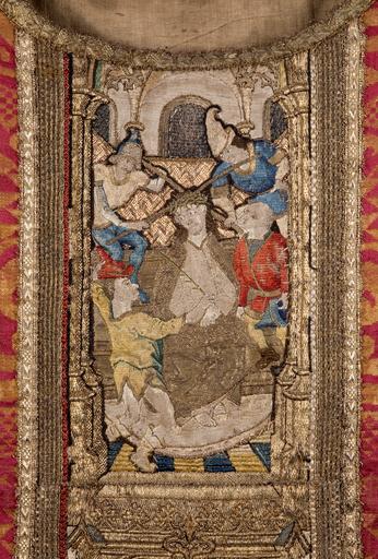 Keywords: MCC-39455 Rood kazuifel met geel granaatappelpatroon, passie- en opstandingsscènes (3).tif Artwork nl onbekend nl Kazuifel in vioolvorm van wijnrood zijdedamast met ingeweven gele granaatappels die gevat zijn in een geknoopte guirlande De voering is van effen ongebleekt linnen De rugzijde toont borduurwerk in de vorm van een latijns kruis met in de kolom vier scènes onder elkaar alle vier opgevat als interieurscènes voor een opgehangen gedamasceerd gordijn Bovenaan onder een baldakijn bekroond met een fleuron en onder een rijk netgewelf hangt de gestorven Christus aan het kruis Maria Magdalena omklemt geknield het kruis links ondersteunt Johannes een bezwijmende Maria Op de achtergrond omringen klagende vrouwen en soldaten het kruis De tweede scène laat de Afname van het kruis zien Nicodemus boven en Joseph van Arimathea onder ondersteunen het lichaam van Christus bij de kruisafname Naast hen een derde figuur op een ladder Magdalena knielt nog steeds aan het kruis en strekt de handen naar de voeten van Christus uit Links Maria Johannes en twee vrouwen Daaronder in de kolom de graflegging Gezamenlijk tillen Jozef van Arimathea de schouders ondersteunend en Nicodemus aan het voeteneind Christus in het graf Links knielt Maria Magdalena een hand van Christus omvattend Achter de tombe Johannes en Maria de handen gekruist voor de borst Achter hen verwanten waarschijnlijk Maria Salome en Maria Cleophas De onderste scene laat de Verrijzenis zien Christus stapt gehuld in een mantel met sluiting uit de tombe een kruisvaan in de linkerhand Rondom de tombe vier slapende soldaten De kruisarmen tonen een afwijkend baldakijntype Onder een eenvoudig gotisch gewelf en tussen boogvensters links een afbeelding van Anna te Drieën en rechts van Maria Magdalena Anna met weduwenkap staat met een opengeslagen boek in de linkerhand Voor haar zit een versneden Mariafiguur met Christus op de schoot Rechts een eveneens versneden Maria Magdalena met een zalfbus in de hand De voorkant toont drie lijdenstaferelen Bovenaan de Bespotting van Christus Hij is gekleed in onderkleed en mantel houdt een rietstengel vast en heeft de doornenkroon op het hoofd Twee beulen achter hem slaan met stokken de kroon dieper in zijn hoofd twee andere beulen jouwen hem uit In het middentafereel de hof van Olijven afgezet met een houten palisade Geknield bidt Christus tot zijn Vader voor hem op een rots de lijdenskelk Op de voorgrond dommelen Jacobus Petrus en Johannes In de onderste scène verschijnt Christus voor Pilatus In het midden Pilatus met een joodse puntmuts zijn handen wassend in een bekken dat hem door een dienaar wordt aangereikt Rechts Christus met geboeide handen gehuld in een schamel gewaad Achter hen een menigte soldaten met pieken en een banier Techniek opgehoogd en gehecht gouddraad in de omlijsting de baldakijnen en de achtergronddraperie Mantels en kleding in de lazuurtechniek gezichten in point miniature haren in kettingsteek Bij het lazuurwerk op de zij-armen gaat de zijde over tweedraads gouddraad between 1495 1504 nl zijdedamast floszijde gouddraad Size 127 67 cm Institution Museum Catharijneconvent place of discovery object history exhibition history credit line nl Foto Museum Catharijneconvent Utrecht foto Ruben de Heer accession number Object number 39455 Inventory number ABM t2005 place of creation nl plaats vervaardiging onzeker Noord-Nederland Utrecht https //www catharijneconvent nl/adlib/39455/ View this work on the website of Museum Catharijneconvent Museum Catharijneconvent Cc-zero Textiles in the Museum Catharijneconvent Media contributed by Museum Catharijneconvent Uploaded with pattypan Chasubles in the Museum Catharijneconvent