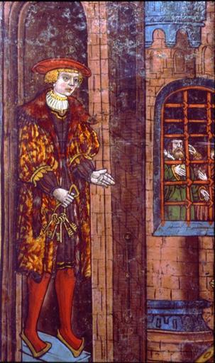 MAKE A MEME View Large Image Veelluik met het martelaarschap van de H. Theodosia (7).jpg Artwork nl Anonymous Gelre nl Middenstuk 1 Theodosia verzoekt toelating tot de gevangenis Rechtsboven een engel met banderol waarop de tekst Ghi sijt verhoert die geve die ghi do ...