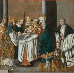 Keywords: MCC-42054 Veelluik met het martelaarschap van de H. Theodosia (47).jpg Artwork nl Anonymous Gelre nl Middenstuk 1 Theodosia verzoekt toelating tot de gevangenis Rechtsboven een engel met banderol waarop de tekst Ghi sijt verhoert die geve die ghi do bidt heb ick gevestigt mit mijnen gelt die martelie te liden 2 Theodosia wordt bij de magistraat ter verantwoording geroepen Op het tekstbord Desen s alch sal ick mitter hulpen des heren voer s en 3 Theodosia ™s marteling aan de hefboom Op het tekstbord Ic ben bereyd dinc voer iezus christo te liden 4a Theodosia aan de schandpaal 4b Theodosia ™s ledematen worden uitgerekt 5 Allegorische voorstelling Christus aan het kruis met het offerlam op zijn schouders; onder het kruis negen schapen Op de voorgrond links een non rechts koning David met een gouden kroon op zijn hoofd en een herdersstaf met schep in beide handen die hij naar de non uitsteekt; tussen hen in ligt een harp Op het tekstbord suster hoede die scapen dier gedacten in die minne des brudegoms iesus opten berch caluarie 6a Theodosia uit het water gered door twee engelen 6b Vijf nonnen en een vrouw in wereldse kledij bezoeken Theodosia in de gevangenis Op het tekstbord min medes elen in cro Christo den enge w ech Het opschrift op de lijst onder de voorstelling is onleesbaar 7 Theodosia voor de wilde dieren geworpen Op het tekstbord nu suldi bekennen hoe vol si vermogen die god mit pueren herten minnen 8 Onthoofding van Theodosia Op het tekstbord dat ic inren tiit des vreden heb vercregen dat sal ic inden striit nie verliesen 9a Verschijning van Theodosia aan haar ouders Op het tekstbord sieh hoe soet die glorie ist daer du mi af beroeven wolste 9b Begrafenis van Theodosia Een zwevende engel met banderol waarop si heft nu salighe vrocht Aan weerszijden van deze taferelen zijn vrouwelijke heiligen afgebeeld steeds twee aan twee met tussen hen in een geknielde non Op de eerste voorstelling links in plaats van een vrouwelijke heilige Maria met kind Links 10a Madonna op de maansikkel en Fides Opschriften / fides 10b Caritas en Spes Opschriften niet leesbaar 11a Agatha en Dorothea Opschriften aghata / doratea 11b Apollonia met attribuut van Agatha tang waarin in plaats van een tand een borst is geklemd en Euphrosia Opschriften appolonia / effrosia 12a Anatolia en Christina Opschriften anatolia / 12b Victoria en Sophia Opschriften victoria / sophia Rechts 13a Margaretha en Gertrudis Opschriften a gretha / gertrudis 13b Ursula en Walburga Opschriften ursula / 14a Catharina en Barbara Opschriften katrina / barbara 14b Agnes en Prisca Opschriften agneta / priska 15a Cecilia en Cunera Opschriften cecilia / cunera 15b Lucia en Clara Opschriften lucia / clara Binnenzijde linkerluiken 16 Kruisdraging met Veronica en Simon van Cyrene 17 Doornenkroning Rechts een als priester geklede heilige met een kelk in de hand en een knielende non 18 Geseling Rechts een H Bisschop 19 Christus in de Hof van Olijven en de stigmatisatie van de Franciscus 20 Besnijdenis Rechts een reguliere kanunnik en een geknielde vrouw in 16de-eeuwse kledij met de attributen van de H Goedele een lantaarn geflankeerd door een engel met een brandende kaars en een duivel met een blaasbalg; daaronder het opschrift gudila 21 Ontkleding van Christus Rechts een heilige met een boek en een ladder 22 Kruisnageling Rechts de apostel Thomas 23 Christus aan het kruis met Maria Johannes en de drie vrouwen Rechts Antonius 24 Bewening Rechts de apostel Paulus en twee geknielde nonnen 25 Christus treedt de wijnpers Links Augustinus rechts een reguliere kanunnik Binnenzijde rechterluiken 26 Aanbidding der koningen 27 Geboorte van Christus Opschrift gloria in excelsis 28a Visitatie 28b Vier nonnen knielend voor een altaar waarop een drieluik met de Kruisiging Achter hen een priester Boven diens hoofd h ia Rechts daarvan een banderol met eenregelige tekst van een lied adv i g i I Fi Filius dn domini 29 Annunciatie Opschrift ave gratia plena 30 Genadestoel Rechtsonder op de voorgrond knielt een non Op het tekstbord god die alle creatueren gescapen heft en ons mit sin dierbaren bloet verlost heft hi wil ock sin gracie geuen ge eit v an der oude naam van de stichtster-non 31 Christus verschijnt aan Maria 32 Hemelvaart van Christus 33 Kroning van Maria 34 Allegorische voorstelling God de Vader gezeten op een troon met op de trappen die naar de troon voeren links de vijf wijze rechts de vijf dwaze maagden; in het midden een engel boven de hellemond met drie verdoemden Op de banderol in de linkerhand van de engel Gae t of Myt ghi vermadi vermaledijden ; op de banderol in zijn rechterhand coemt ghi gebenedide Op het tekstbord bij de wijze maagden gaet tot der gene daer se te coop is Op het tekstbord bij de dwaze maagden geft ons den olie vor ons lamp Op de banderol aan de onderzijde van de voorstelling rick der hemelen sal worden all fiere maechden Buitenzijde linkerluiken Nr 35 36 en 40 t/m 44 zijn gewijd aan de zeven vallen van Christus De voorstellingen zijn zeer verwant aan zeven houtsneden met dit thema gedrukt op één blad getiteld ˜O mensch betracht dy siben vell Christi und dy siben herzenlaydt Marie ™ Wenen Albertina inv nr 1930-70 Zuid-Duitsland ca 1480; zie Marrow 1979 p 82 89 100 106 131 170 pl VIII 35 Christus ™ val voor de kruisnageling zesde val 36 Kruisoprichting zevende val 37 Allegorische voorstelling Christus als Man van Smarten en gebonden aan de geselpaal houdt een rood koord vast dat verbonden is met een knielende non Tekstrol Christus o dochter vollighet my want ic gepassijt bin voor di wilt mij u hert geven om ewich te leuen Tekstrol non here ic offer u myn hert nu ende inder ewicheit Achter de non zeven kleinere opschriften verwijzend naar zeven deugden elk voorafgegaan door een hand met een geselroede waarvan de eerste en de derde onleesbaar zijn 2 die mel it mildheid ; 4 gehoorsamheijt; 5 wakinge; 6 silencia ; 7 arheyt waarheid 38 Allegorische voorstelling In een ommuurde tuin slaat Christus met een hamer op 