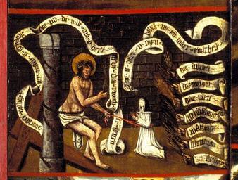 Keywords: MCC-42054 Veelluik met het martelaarschap van de H. Theodosia (65).jpg Artwork nl Anonymous Gelre nl Middenstuk 1 Theodosia verzoekt toelating tot de gevangenis Rechtsboven een engel met banderol waarop de tekst Ghi sijt verhoert die geve die ghi do bidt heb ick gevestigt mit mijnen gelt die martelie te liden 2 Theodosia wordt bij de magistraat ter verantwoording geroepen Op het tekstbord Desen s alch sal ick mitter hulpen des heren voer s en 3 Theodosia ™s marteling aan de hefboom Op het tekstbord Ic ben bereyd dinc voer iezus christo te liden 4a Theodosia aan de schandpaal 4b Theodosia ™s ledematen worden uitgerekt 5 Allegorische voorstelling Christus aan het kruis met het offerlam op zijn schouders; onder het kruis negen schapen Op de voorgrond links een non rechts koning David met een gouden kroon op zijn hoofd en een herdersstaf met schep in beide handen die hij naar de non uitsteekt; tussen hen in ligt een harp Op het tekstbord suster hoede die scapen dier gedacten in die minne des brudegoms iesus opten berch caluarie 6a Theodosia uit het water gered door twee engelen 6b Vijf nonnen en een vrouw in wereldse kledij bezoeken Theodosia in de gevangenis Op het tekstbord min medes elen in cro Christo den enge w ech Het opschrift op de lijst onder de voorstelling is onleesbaar 7 Theodosia voor de wilde dieren geworpen Op het tekstbord nu suldi bekennen hoe vol si vermogen die god mit pueren herten minnen 8 Onthoofding van Theodosia Op het tekstbord dat ic inren tiit des vreden heb vercregen dat sal ic inden striit nie verliesen 9a Verschijning van Theodosia aan haar ouders Op het tekstbord sieh hoe soet die glorie ist daer du mi af beroeven wolste 9b Begrafenis van Theodosia Een zwevende engel met banderol waarop si heft nu salighe vrocht Aan weerszijden van deze taferelen zijn vrouwelijke heiligen afgebeeld steeds twee aan twee met tussen hen in een geknielde non Op de eerste voorstelling links in plaats van een vrouwelijke heilige Maria met kind Links 10a Madonna op de maansikkel en Fides Opschriften / fides 10b Caritas en Spes Opschriften niet leesbaar 11a Agatha en Dorothea Opschriften aghata / doratea 11b Apollonia met attribuut van Agatha tang waarin in plaats van een tand een borst is geklemd en Euphrosia Opschriften appolonia / effrosia 12a Anatolia en Christina Opschriften anatolia / 12b Victoria en Sophia Opschriften victoria / sophia Rechts 13a Margaretha en Gertrudis Opschriften a gretha / gertrudis 13b Ursula en Walburga Opschriften ursula / 14a Catharina en Barbara Opschriften katrina / barbara 14b Agnes en Prisca Opschriften agneta / priska 15a Cecilia en Cunera Opschriften cecilia / cunera 15b Lucia en Clara Opschriften lucia / clara Binnenzijde linkerluiken 16 Kruisdraging met Veronica en Simon van Cyrene 17 Doornenkroning Rechts een als priester geklede heilige met een kelk in de hand en een knielende non 18 Geseling Rechts een H Bisschop 19 Christus in de Hof van Olijven en de stigmatisatie van de Franciscus 20 Besnijdenis Rechts een reguliere kanunnik en een geknielde vrouw in 16de-eeuwse kledij met de attributen van de H Goedele een lantaarn geflankeerd door een engel met een brandende kaars en een duivel met een blaasbalg; daaronder het opschrift gudila 21 Ontkleding van Christus Rechts een heilige met een boek en een ladder 22 Kruisnageling Rechts de apostel Thomas 23 Christus aan het kruis met Maria Johannes en de drie vrouwen Rechts Antonius 24 Bewening Rechts de apostel Paulus en twee geknielde nonnen 25 Christus treedt de wijnpers Links Augustinus rechts een reguliere kanunnik Binnenzijde rechterluiken 26 Aanbidding der koningen 27 Geboorte van Christus Opschrift gloria in excelsis 28a Visitatie 28b Vier nonnen knielend voor een altaar waarop een drieluik met de Kruisiging Achter hen een priester Boven diens hoofd h ia Rechts daarvan een banderol met eenregelige tekst van een lied adv i g i I Fi Filius dn domini 29 Annunciatie Opschrift ave gratia plena 30 Genadestoel Rechtsonder op de voorgrond knielt een non Op het tekstbord god die alle creatueren gescapen heft en ons mit sin dierbaren bloet verlost heft hi wil ock sin gracie geuen ge eit v an der oude naam van de stichtster-non 31 Christus verschijnt aan Maria 32 Hemelvaart van Christus 33 Kroning van Maria 34 Allegorische voorstelling God de Vader gezeten op een troon met op de trappen die naar de troon voeren links de vijf wijze rechts de vijf dwaze maagden; in het midden een engel boven de hellemond met drie verdoemden Op de banderol in de linkerhand van de engel Gae t of Myt ghi vermadi vermaledijden ; op de banderol in zijn rechterhand coemt ghi gebenedide Op het tekstbord bij de wijze maagden gaet tot der gene daer se te coop is Op het tekstbord bij de dwaze maagden geft ons den olie vor ons lamp Op de banderol aan de onderzijde van de voorstelling rick der hemelen sal worden all fiere maechden Buitenzijde linkerluiken Nr 35 36 en 40 t/m 44 zijn gewijd aan de zeven vallen van Christus De voorstellingen zijn zeer verwant aan zeven houtsneden met dit thema gedrukt op één blad getiteld ˜O mensch betracht dy siben vell Christi und dy siben herzenlaydt Marie ™ Wenen Albertina inv nr 1930-70 Zuid-Duitsland ca 1480; zie Marrow 1979 p 82 89 100 106 131 170 pl VIII 35 Christus ™ val voor de kruisnageling zesde val 36 Kruisoprichting zevende val 37 Allegorische voorstelling Christus als Man van Smarten en gebonden aan de geselpaal houdt een rood koord vast dat verbonden is met een knielende non Tekstrol Christus o dochter vollighet my want ic gepassijt bin voor di wilt mij u hert geven om ewich te leuen Tekstrol non here ic offer u myn hert nu ende inder ewicheit Achter de non zeven kleinere opschriften verwijzend naar zeven deugden elk voorafgegaan door een hand met een geselroede waarvan de eerste en de derde onleesbaar zijn 2 die mel it mildheid ; 4 gehoorsamheijt; 5 wakinge; 6 silencia ; 7 arheyt waarheid 38 Allegorische voorstelling In een ommuurde tuin slaat Christus met een hamer op 