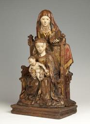 Keywords: MCC-42227 Anna-te-Drieën (2).tif Artwork nl Anonymous Noord-Nederland Anonymous Utrecht nl Anna buigt zich over de rugleuning van de zetel waarop Maria is gezeten die het naakte kind op haar schoot houdt Anna draagt in haar linkerhand een opengeslagen boek Haar rechterhand houdt ze op Maria's rechterschouder Haar hoog opgetrokken linkerbeen staat op een bankje dat van achter de zetel zichtbaar is Het Christuskind laat zijn rechterhand rusten op de appel die Maria in haar rechterhand draagt Het heeft zich iets naar links gewend en laat zijn linkerhand rusten op de linkerarm van Maria Maria ondersteunt met haar linkerhand de opgetrokken beentjes van het kind en houdt zijn rechtervoetje vast Opvallend is de sterk gebogen stand van Maria's rechterbeen waarvan de knie naar binnen is gewend Haar voet lijkt uit haar slof te schieten Anna met hoofd- en kindoek draagt een lang kleed en een over het hoofd geslagen mantel Maria is gekleed in een lang gewaad en mantel en heeft een bloemenkrans om het hoofd Maria en Anna dragen sloffen met ronde neuzen Het kind heeft een geschilderde bloedkoralen ketting om de hals waaraan vroeger een kruisje eveneens geschilderd hing De zetel heeft een hoge brede rugleuning met verdiept middenveld omlijst door een geprofileerde rand en op de bovenhoeken uitkragende versieringen in de vorm van zeer gestileerde pinakels De lage armleuningen zijn aan de bovenzijde hol en aan de voorzijde voorzien van een bolprofiel waaronder een kwarthol en enkele rechte profielen Links en rechts in de voorzijde onder de leuningen een blindnis met twee toten Het bankje achter de zetel heeft een geprofileerde bovenrand De zetel is geplaatst op een grond met smalle parallelle groeven Het beeld staat op een losse rechthoekige geprofileerde plint waarin vier gaten met resten van de nagels voor de bevestiging aanwezig zijn De onderzijde van de plint is uitgehold Polychromie De polychromie is aangebracht op een dunne witte grond de vergulding op een geel-bruine bolus Het incarnaat is bijna wit met roze blossen Helderrode lippen Wimpers rimpels en plooien zijn heel gedetailleerd weergegeven in rose-bruine tinten Bij het kind zijn de details van de oren roze De vingernagels zijn wit met een rode rand Bij Maria en Anna zijn nog bruine irissen aanwezig De wenkbrauwen zijn bruin Het incarnaat van de gezichten wordt begrensd door een roze lijn; zo ook de halspartijen De haren van Maria en het kind zijn verguld Anna's kleed heeft een polimentvergulding De binnenkant van het kleed ter hoogte van de handen is rood met groefjes om bont te suggereren Langs de zoom een dubbele rode lijn Anna's mantel is rood met gouden rand en een zwarte bies tussen het rood en het goud De binnenkant van de mantel is azurietblauw op een zwarte grond De kindoek heeft een dubbele roze bies De doek zelf is wit of grijzig resten blauw pigment Het boek heeft een zwarte band witte bladen met zwarte letters rode beginkapitalen en pargraaftekens en is goud op snee De marges van de tekst zijn aangegeven met een rode lijn Maria heeft een goudkleurig gewaad met roodversierd boord en een brede versierde rand langs de mouwen Aan de binnenkant van de mouwen links groen en rechts groen en blauw De buitenzijde van de blauwe mantel heeft brede gouden boorden waarlangs een gouden lijn; erboven een schulpmotief met op elke punt drie stipjes waardoor een gestileerd bloemmotief ontstaat De binnenkant van de mantel is rood met een smalle gouden bies met zwarte belijning De bloemen van de krans hebben vergulde hartjes en vertonen verder sporen rood De appel vertoont sporen van vergulding en rood onderaan bij de hand van Maria en bij de vingers van het kind Het schoeisel is zwart de binnenkant van Maria's slof is geel haar kous rood Het middenveld van de leuning van de zetel vertoont een brokaatmotief met donkerbruine tot groenige lijnen op goud De spaarvelden in de blindnissen zijn roze de randen van de blindnissen verguld De profilering daarboven en onder afwisselend goud en roze De plint en de zijkanten van de zetel zijn bruin-rood de binnenzijde van de armleuningen roze-rood en de profielen goudkleurig Het zitgedeelte is roze De omlijsting van de rugleuning is gemarmerd in bruinige en zwarte en grijs-roodachtige tinten De knoppen boven op de rugleuningprofilering afwisselend goud en rose Over het algemeen zijn de terugliggende profielen roze en de uitspringende profielen verguld Het bankje van Anna lijkt rood-bruin Op de grond nog een klein restje geel-groen Op de achterzijde is het rood van Anna's mantel op haar hoofd en schouders en op haar linkerbeen doorgezet Techniek De achterzijde is vrij grof afgevlakt De kern ligt links in het werkblok Op het standvlak parallelle gutssporen Een kleine vierkant gaatje bovenin het hoofd van Anna In de rugleuning aan de voorzijde een noest Staat Afgebroken een stukje uit de bloemenkrans; het rechterbolprofiel van de stoelleuning; een hoek van het profiel daaronder; enkele delen uit de grond vooral links wat grotere stukken Scheurvorming vanuit de kern Een grote scheur in de voorzijde is dichtgezet met hout en kunsthars Een gaatje in de rug en twee moderne schroefgaten In het standvlak drie vierkante spijkergaten waarvan twee met resten van spijkers en een onregelmatig ondiep gat De polychromie is over de gehele oppervlakte beschadigd en gesleten vooral op het kleed van Maria between 1495 1504 nl eikenhout verf Size 51 0 29 0 cm nl Hoogte 51 0cm Breedte 29 0cm Diepte 18 0cm Institution Museum Catharijneconvent object history exhibition history credit line nl Foto Museum Catharijneconvent Utrecht foto Ruben de Heer accession number Object number 42227 Inventory number ABM bh00499 place of creation https //www catharijneconvent nl/adlib/42227/ View this work on the website of Museum Catharijneconvent Museum Catharijneconvent Cc-zero <gallery> File MCC-42227_Anna-te-Drieën_ 6 tif File MCC-42227_Anna-te-Drieën_ 1 tif File MCC-42227_Anna-te-Drieën_ 11 tif File MCC-42227_Anna-te-Drieën_ 3 tif 