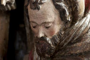 | Keywords: MCC-42318 Geboorte van Christus, aanbidding der herders (27).tif Artwork nl Anonymous Utrecht nl Voor een vervallen stal in het midden van de voorstelling knielt Maria links in aanbidding neer bij het kindje dat in het stro ligt Ook zijn twee engelen bij het kind neergeknield De ene en profil rechts op de voorgrond bespeelt een harp die hij voor zich houdt De andere zit schuin achter het kindje rechts van Maria en heeft zijn handen gevouwen voor zich Achter de harpspelende engel staat Jozef driekwart naar links gewend Hij kijkt wat voorovergebogen op het kind neer In zijn verdwenen linkerhand droeg hij waarschijnlijk een kaars waarvan hij het licht met zijn geheven rechter hand afschermde tegen de stralen die van het kind uitgaan Op de achtergrond rechts boven op een rots of heuvel staat een derde engel die met zijn rechterhand het kind aanwijst aan een klein afgebeelde herder die rechts naast hem loopt In de stal achter een met leem bestreken tenen wand kijkt nog een herder toe waarvan alleen het hoofd en de schouders zichtbaar zijn Het dak van de stal rust op vier pilaren In de voorzijde ervan is een rechthoekig venster aangebracht waarin twee duifjes zitten Tussen de twee linkerpilaren door hebben de os en de ezel hun koppen naar buiten gestoken Terwijl de os naar voren kijkt neemt de ezel een flinke hap stro uit de kribbe die voor hem staat Het linker gedeelte van de voorstelling wordt ingenomen door een grote rotsige heuvelpartij waarvoor een herder staat Hij heeft zijn bovenlichaam bijna en profil naar rechts gedraaid en zijn linkerbeen iets naar voren geplaatst en kijkt naar het geboortetafereel Hij leunt met beide handen op een herdersstaf die aan de onderzijde voorzien is van een schep De heuvelige bodem is afgewerkt met zigzaggroeven Maria draagt een lang gewaad Haar mantel is van haar rechterschouder gegleden tot op haar heupen en bedekt in soepele plooien de grond Haar kleed heeft omgeslagen mouwboorden Over haar hoofd een deels teruggeslagen sluier De engelen zijn gekleed in gegorde albes De achterste engel heeft een diadeem op het hoofd Aan de gordel rond Jozefs kleed hangt een rozenkrans Zijn mantel is teruggeslagen over zijn linker schouder Op zijn hoofd een kaproenachtig hoofddeksel en om zijn hals een grote sjaal De herder rechts op de achtergrond heeft een hoed met opgeslagen achterrand op het hoofd Hij draagt een korte gegorde tuniek met v-hals Aan zijn riem hangen een tas en een hoornachtig voorwerp Hij heeft puntig schoeisel en zijn kousen lijken afgerold Van de herder achter de wand is alleen te zien dat hij een kap draagt De linker herder is gekleed in een korte gegorde tuniek met kort ingesneden wambuis en lage schoenen met afgeronde neus Op zijn hoofd een hoed waar aan de linkerkant een doek onderuit hangt Zijn handen zijn in wanten gestoken Polychromie Het stuk is deels bedekt met oude maar niet oorspronkelijke polychromie De bruine retouches van de witte grond en de lacunes maken het moeilijk nog onderliggende lagen te onderscheiden Het stuk lijkt grondig schoongemaakt voordat het opnieuw is gestoffeerd Incarnaat lichtroze met rode blossen De herders vertonen een oranje-achtig incarnaat De ogen zijn gedetailleerd in zwart en bruin; monden helderrood Maria's haar is bruin haar sluier en binnenkant van de mantel blauw; buitenzijden mantel deels rood deels blauw verkeerd geïnterpreteerd door de stoffeerder ; gewaad rood met vergulde boorden De matte vergulding lijkt op een gelige grond te liggen De albes van de engelen zijn roze Hun haar matverguld op een gelige grond De harp is verguld De boorden van de albes zijn verguld Jozef haar bruin rand van de hoed verguld op gelige grond; slip rood; sjaal wit; kleed en rozenkrans rood; mantel bruin Kleine herder hoed rood; haar donkerbruin waaronder resten van oranjerood bolus ; kleed blauw; hoorn gordel en tas gelig; kousen en schoenen donkerrood Kap herder blauw met een witte rand Os rood tanden wit hoorns roze Ezel lichtbruin Stro geel Ruif lichtbruin waarop donkerbruin Herder links hoed blauw met rode slip; wambuis bruin met rode kraag manchetten en split; tuniek blauw waarop sporen vergulding; buidel lichtgeel; kousen wit; schoenen donkerbruin Onder het wit van de kousen mogelijk roze incarnaat Staf lichtbruin met blauwe schep Stal zuilen en achterwand rechts donkerbruin; strodak geelbruin; gevel donkerbruin met witte duifjes waarvan er een een rode snavel heeft; wand blauw; vleugels middelste geknielde engel wit met vergulde rand Heuvels resten geel bruin en groen Het geel ligt deels over het groen Rotsen links bovenaan heel lichtroze waaronder vergulding op rood-achtige bolus Techniek De groep is uit meerdere delen samengesteld Het rechtergedeelte met de stal Maria Jozef en de engelen vormt één geheel uitgezonderd de rechts op de voorgrond knielende engel en het kindje op het stro De kern lag achter het werkblok Aan dit gedeelte zijn toegevoegd het rechterduifje in de stal genoemd kindje en engel en de grond onder de engel De figuren op de voorgrond zijn rondom bewerkt Het linkergedeelte met de rotsen en de grote herderfiguur vormt één geheel De herder is bijna rondom uitgewerkt De twee delen zijn aan elkaar gezet door middel van houten pennen en verbindingsplankjes die met grote nagels in de onderzijde van de delen zijn bevestigd Ook bovenaan de achterzijde bevindt zich een origineel verbindingsplankje vastgezet met zes gesmede nagels twee verdwenen Mogelijk liep dit plankje verder door naar links waar nog twee gesmede nagels aanwezig zijn Een deel van de grond tussen beide delen vormt eveneens een verbinding en is met twee houten pennen en een ijzeren nagel in de voorzijde vastgezet De grond onder de engel is met houten pennen en een metalen nagel bevestigd Het kind is op de grond gelijmd en ingepend De harp bestaat uit twee delen De linkerhand van de linkerengel vormt één geheel met de snaren De delen lijken gelijmd en daarna met een grote nagel onderaan in de engel vastgezet Het rechter duif