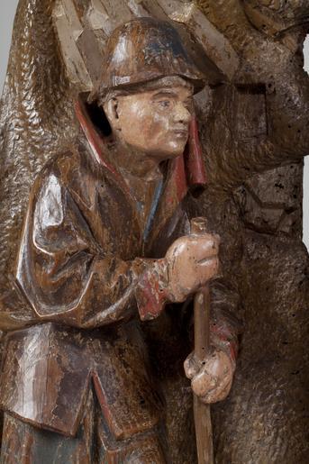 | Keywords: MCC-42318 Geboorte van Christus, aanbidding der herders (7).tif Artwork nl Anonymous Utrecht nl Voor een vervallen stal in het midden van de voorstelling knielt Maria links in aanbidding neer bij het kindje dat in het stro ligt Ook zijn twee engelen bij het kind neergeknield De ene en profil rechts op de voorgrond bespeelt een harp die hij voor zich houdt De andere zit schuin achter het kindje rechts van Maria en heeft zijn handen gevouwen voor zich Achter de harpspelende engel staat Jozef driekwart naar links gewend Hij kijkt wat voorovergebogen op het kind neer In zijn verdwenen linkerhand droeg hij waarschijnlijk een kaars waarvan hij het licht met zijn geheven rechter hand afschermde tegen de stralen die van het kind uitgaan Op de achtergrond rechts boven op een rots of heuvel staat een derde engel die met zijn rechterhand het kind aanwijst aan een klein afgebeelde herder die rechts naast hem loopt In de stal achter een met leem bestreken tenen wand kijkt nog een herder toe waarvan alleen het hoofd en de schouders zichtbaar zijn Het dak van de stal rust op vier pilaren In de voorzijde ervan is een rechthoekig venster aangebracht waarin twee duifjes zitten Tussen de twee linkerpilaren door hebben de os en de ezel hun koppen naar buiten gestoken Terwijl de os naar voren kijkt neemt de ezel een flinke hap stro uit de kribbe die voor hem staat Het linker gedeelte van de voorstelling wordt ingenomen door een grote rotsige heuvelpartij waarvoor een herder staat Hij heeft zijn bovenlichaam bijna en profil naar rechts gedraaid en zijn linkerbeen iets naar voren geplaatst en kijkt naar het geboortetafereel Hij leunt met beide handen op een herdersstaf die aan de onderzijde voorzien is van een schep De heuvelige bodem is afgewerkt met zigzaggroeven Maria draagt een lang gewaad Haar mantel is van haar rechterschouder gegleden tot op haar heupen en bedekt in soepele plooien de grond Haar kleed heeft omgeslagen mouwboorden Over haar hoofd een deels teruggeslagen sluier De engelen zijn gekleed in gegorde albes De achterste engel heeft een diadeem op het hoofd Aan de gordel rond Jozefs kleed hangt een rozenkrans Zijn mantel is teruggeslagen over zijn linker schouder Op zijn hoofd een kaproenachtig hoofddeksel en om zijn hals een grote sjaal De herder rechts op de achtergrond heeft een hoed met opgeslagen achterrand op het hoofd Hij draagt een korte gegorde tuniek met v-hals Aan zijn riem hangen een tas en een hoornachtig voorwerp Hij heeft puntig schoeisel en zijn kousen lijken afgerold Van de herder achter de wand is alleen te zien dat hij een kap draagt De linker herder is gekleed in een korte gegorde tuniek met kort ingesneden wambuis en lage schoenen met afgeronde neus Op zijn hoofd een hoed waar aan de linkerkant een doek onderuit hangt Zijn handen zijn in wanten gestoken Polychromie Het stuk is deels bedekt met oude maar niet oorspronkelijke polychromie De bruine retouches van de witte grond en de lacunes maken het moeilijk nog onderliggende lagen te onderscheiden Het stuk lijkt grondig schoongemaakt voordat het opnieuw is gestoffeerd Incarnaat lichtroze met rode blossen De herders vertonen een oranje-achtig incarnaat De ogen zijn gedetailleerd in zwart en bruin; monden helderrood Maria's haar is bruin haar sluier en binnenkant van de mantel blauw; buitenzijden mantel deels rood deels blauw verkeerd geïnterpreteerd door de stoffeerder ; gewaad rood met vergulde boorden De matte vergulding lijkt op een gelige grond te liggen De albes van de engelen zijn roze Hun haar matverguld op een gelige grond De harp is verguld De boorden van de albes zijn verguld Jozef haar bruin rand van de hoed verguld op gelige grond; slip rood; sjaal wit; kleed en rozenkrans rood; mantel bruin Kleine herder hoed rood; haar donkerbruin waaronder resten van oranjerood bolus ; kleed blauw; hoorn gordel en tas gelig; kousen en schoenen donkerrood Kap herder blauw met een witte rand Os rood tanden wit hoorns roze Ezel lichtbruin Stro geel Ruif lichtbruin waarop donkerbruin Herder links hoed blauw met rode slip; wambuis bruin met rode kraag manchetten en split; tuniek blauw waarop sporen vergulding; buidel lichtgeel; kousen wit; schoenen donkerbruin Onder het wit van de kousen mogelijk roze incarnaat Staf lichtbruin met blauwe schep Stal zuilen en achterwand rechts donkerbruin; strodak geelbruin; gevel donkerbruin met witte duifjes waarvan er een een rode snavel heeft; wand blauw; vleugels middelste geknielde engel wit met vergulde rand Heuvels resten geel bruin en groen Het geel ligt deels over het groen Rotsen links bovenaan heel lichtroze waaronder vergulding op rood-achtige bolus Techniek De groep is uit meerdere delen samengesteld Het rechtergedeelte met de stal Maria Jozef en de engelen vormt één geheel uitgezonderd de rechts op de voorgrond knielende engel en het kindje op het stro De kern lag achter het werkblok Aan dit gedeelte zijn toegevoegd het rechterduifje in de stal genoemd kindje en engel en de grond onder de engel De figuren op de voorgrond zijn rondom bewerkt Het linkergedeelte met de rotsen en de grote herderfiguur vormt één geheel De herder is bijna rondom uitgewerkt De twee delen zijn aan elkaar gezet door middel van houten pennen en verbindingsplankjes die met grote nagels in de onderzijde van de delen zijn bevestigd Ook bovenaan de achterzijde bevindt zich een origineel verbindingsplankje vastgezet met zes gesmede nagels twee verdwenen Mogelijk liep dit plankje verder door naar links waar nog twee gesmede nagels aanwezig zijn Een deel van de grond tussen beide delen vormt eveneens een verbinding en is met twee houten pennen en een ijzeren nagel in de voorzijde vastgezet De grond onder de engel is met houten pennen en een metalen nagel bevestigd Het kind is op de grond gelijmd en ingepend De harp bestaat uit twee delen De linkerhand van de linkerengel vormt één geheel met de snaren De delen lijken gelijmd en daarna met een grote nagel onderaan in de engel vastgezet Het rechter duifj