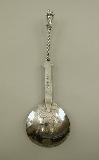 View Original:MCC-5687 Apostellepel (geboortelepel) met apostel Simon, deels getordeerde steel met onderaan reiger, kz. met "S. Simon", wapens met "ML", "SE" en "1655" (2).jpg (981x1584)