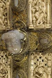 Keywords: MCC-61050 Evangeliarium (Lebuïnuscodex) (321).jpg Artwork nl Anonymous Noordoost-Frankrijk Anonymous Rijnland Anonymous Maasland nl De kern van de boekband van de Lebuïnuscodex wordt gevormd door twee eikenhouten platten De rug en het achterplat zijn overtrokken met zeemleer Het voorplat is rijkelijk versierd met verguld zilversmeedwerk reliëfs van walrustand en verscheidene stenen De compositie van de bekleding van het voorplat wordt bepaald door een verguld zilveren filigraankruis Aan de uiteinden van de kruisarmen bevinden zich vierpassen met overhoeks vierkant eveneens met filigraan gedecoreerd Hiervan zijn er slechts twee bewaard gebleven en wel die aan de verticale kruisarmen Zij bevatten tevens nog de oorspronkelijke versiering bestaande uit een filigraanmedaillon met een pseudo-camee van respectievelijk een mannen- en een vrouwenhoofd in profiel Het snijpunt van het kruis wordt ingenomen door een ver vooruitstekend Bacchuskopje in chalcedoon te herkennen aan de kleine druiventrosjes in zijn haartooi Het kopje is gevat in een filigraanmedaillon welke op zijn beurt weer is geplaatst op een vierpas van filigraanwerk Op elk van de kruisarmen bevindt zich een ovale steen 'en cabochon' op een medaillon met filigraan Het filigraanwerk van kruis en sierstukken is in de vorm van visblazen In de ruimten tussen de kruisarmen zijn rechthoekige reliëfs van walrustand aangebracht met de vier evangelisten en hun symbool De reliëfs hebben de volgende afmetingen H 10 0 x B 5 5 cm Van links boven naar rechts onder betreft het Mattheus met de engel Johannes met de adelaar Marcus met de gevleugelde leeuw en Lucas met de gevleugelde os De figuren zijn paarsgewijs als elkaars spiegelbeeld ten opzichte van de middenas geplaatst Mattheus en Johannes zitten vrijwel geheel frontaal terwijl Marcus en Lucas meer in profiel zijn afgebeeld Qua opbouw verschillen de vier reliëfs nauwelijks van elkaar Binnen een rand van vierlobbige blaadjes verheffen zich twee zuilen met een basis een kapiteel en een dekplaat Hierop rust een rondboog geflankeerd door twee torens en afgedekt met een fronton dat boven Mattheus en Johannes boogvormig en boven Marcus en Lucas driehoekig is Onder deze overhuiving zitten de evangelisten gekleed in een lang gewaad en mantel met gekruiste benen aan een lessenaar hun blote voeten rustend op een bankje Allen zijn baardeloos en voorzien van een nimbus Voorts houden ze een pen in hun rechterhand terwijl hun linker op een boek ligt of gebarend is opgeheven Boven elk van de evangelisten verschijnt in de opening van het fronton zijn symbool met een spreukband Dit rijkelijk gedecoreerde middenveld wordt omlijst door sierbanden van verguld koper De opbouw van de sierlijsten is steeds dezelfde een opstaande smalle band die op regelmatige afstanden is voorzien van holten met aan weerszijden een brede strook voorzien van een gestanst motief Aan de lange zijden van de boekband bestaat het motief uit palmetten aan de korte zijden uit rozetten Van deze laatstgenoemde stroken ontbreekt steeds de buitenste rand Bij alle stroken met palmettenmotief wijzen de palmetten naar links met uitzondering van de buitenste strook rechtsboven die het motief in tegengestelde richting toont Verguld zilveren rozetten op de hoeken van het voorplat omgeven door een smalle rand van filigraanwerk met cirkelmotief en bekroond met een 'en cabochon' gezette steen completeren het geheel Van de rozet links onder ontbreekt de steen en is slechts de buitenste rand over Aan de voorzijde van de boekband bevinden zich nog de rudimenten van twee sluitingen between u'825' u'1000' u'1150' u'850' u'1199' u'1199' nl perkament eikenhout zilver goud koper walrustand chalcedoon glas leer Size 35 5 26 0 cm nl Hoogte 35 5cm Breedte 26 0cm Diepte 13 5cm Institution Museum Catharijneconvent object history exhibition history credit line nl Foto Museum Catharijneconvent Utrecht foto HetFotoAtelier Peter Rothengatter Reproduction title nl Boekband voorzijde detail met Bacchuskopje accession number Object number 61050 Inventory number ABM h1 place of creation https //www catharijneconvent nl/adlib/61050/ View this work on the website of Museum Catharijneconvent Museum Catharijneconvent Cc-zero <gallery> File MCC-61050_Evangeliarium_Lebuïnuscodex_ 11 jpg File MCC-61050_Evangeliarium_Lebuïnuscodex_ 172 jpg File MCC-61050_Evangeliarium_Lebuïnuscodex_ 212 jpg File MCC-61050_Evangeliarium_Lebuïnuscodex_ 61 jpg File MCC-61050_Evangeliarium_Lebuïnuscodex_ 12 jpg File MCC-61050_Evangeliarium_Lebuïnuscodex_ 213 jpg File MCC-61050_Evangeliarium_Lebuïnuscodex_ 56 jpg File MCC-61050_Evangeliarium_Lebuïnuscodex_ 232 jpg File MCC-61050_Evangeliarium_Lebuïnuscodex_ 93 jpg File MCC-61050_Evangeliarium_Lebuïnuscodex_ 99 jpg File MCC-61050_Evangeliarium_Lebuïnuscodex_ 184 jpg File MCC-61050_Evangeliarium_Lebuïnuscodex_ 64 jpg File MCC-61050_Evangeliarium_Lebuïnuscodex_ 299 jpg File MCC-61050_Evangeliarium_Lebuïnuscodex_ 86 jpg File MCC-61050_Evangeliarium_Lebuïnuscodex_ 260 jpg File MCC-61050_Evangeliarium_Lebuïnuscodex_ 159 jpg File MCC-61050_Evangeliarium_Lebuïnuscodex_ 247 jpg File MCC-61050_Evangeliarium_Lebuïnuscodex_ 180 jpg File MCC-61050_Evangeliarium_Lebuïnuscodex_ 121 jpg File MCC-61050_Evangeliarium_Lebuïnuscodex_ 315 jpg File MCC-61050_Evangeliarium_Lebuïnuscodex_ 284 jpg File MCC-61050_Evangeliarium_Lebuïnuscodex_ 33 jpg File MCC-61050_Evangeliarium_Lebuïnuscodex_ 44 jpg File MCC-61050_Evangeliarium_Lebuïnuscodex_ 258 jpg File MCC-61050_Evangeliarium_Lebuïnuscodex_ 237 jpg File MCC-61050_Evangeliarium_Lebuïnuscodex_ 20 jpg File MCC-61050_Evangeliarium_Lebuïnuscodex_ 220 jpg File MCC-61050_Evangeliarium_Lebuïnuscodex_ 279 jpg File MCC-61050_Evangeliarium_Lebuïnuscodex_ 183 jpg File MCC-61050_Evangeliarium_Lebuïnuscodex_ 60 jpg File MCC-61050_Evangeliarium_Lebuïnuscodex_ 166 jpg File MCC-61050_Evangeliarium_Lebuïnuscodex_ 97 jpg File MCC-61050_Evangeliarium_Lebuïnuscodex_ 71 jpg File MCC-61050_Evangeliari