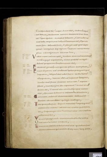 | Keywords: MCC-61050 Evangeliarium (Lebuïnuscodex) (128).jpg Artwork nl Anonymous Noordoost-Frankrijk Anonymous Rijnland Anonymous Maasland nl De kern van de boekband van de Lebuïnuscodex wordt gevormd door twee eikenhouten platten De rug en het achterplat zijn overtrokken met zeemleer Het voorplat is rijkelijk versierd met verguld zilversmeedwerk reliëfs van walrustand en verscheidene stenen De compositie van de bekleding van het voorplat wordt bepaald door een verguld zilveren filigraankruis Aan de uiteinden van de kruisarmen bevinden zich vierpassen met overhoeks vierkant eveneens met filigraan gedecoreerd Hiervan zijn er slechts twee bewaard gebleven en wel die aan de verticale kruisarmen Zij bevatten tevens nog de oorspronkelijke versiering bestaande uit een filigraanmedaillon met een pseudo-camee van respectievelijk een mannen- en een vrouwenhoofd in profiel Het snijpunt van het kruis wordt ingenomen door een ver vooruitstekend Bacchuskopje in chalcedoon te herkennen aan de kleine druiventrosjes in zijn haartooi Het kopje is gevat in een filigraanmedaillon welke op zijn beurt weer is geplaatst op een vierpas van filigraanwerk Op elk van de kruisarmen bevindt zich een ovale steen 'en cabochon' op een medaillon met filigraan Het filigraanwerk van kruis en sierstukken is in de vorm van visblazen In de ruimten tussen de kruisarmen zijn rechthoekige reliëfs van walrustand aangebracht met de vier evangelisten en hun symbool De reliëfs hebben de volgende afmetingen H 10 0 x B 5 5 cm Van links boven naar rechts onder betreft het Mattheus met de engel Johannes met de adelaar Marcus met de gevleugelde leeuw en Lucas met de gevleugelde os De figuren zijn paarsgewijs als elkaars spiegelbeeld ten opzichte van de middenas geplaatst Mattheus en Johannes zitten vrijwel geheel frontaal terwijl Marcus en Lucas meer in profiel zijn afgebeeld Qua opbouw verschillen de vier reliëfs nauwelijks van elkaar Binnen een rand van vierlobbige blaadjes verheffen zich twee zuilen met een basis een kapiteel en een dekplaat Hierop rust een rondboog geflankeerd door twee torens en afgedekt met een fronton dat boven Mattheus en Johannes boogvormig en boven Marcus en Lucas driehoekig is Onder deze overhuiving zitten de evangelisten gekleed in een lang gewaad en mantel met gekruiste benen aan een lessenaar hun blote voeten rustend op een bankje Allen zijn baardeloos en voorzien van een nimbus Voorts houden ze een pen in hun rechterhand terwijl hun linker op een boek ligt of gebarend is opgeheven Boven elk van de evangelisten verschijnt in de opening van het fronton zijn symbool met een spreukband Dit rijkelijk gedecoreerde middenveld wordt omlijst door sierbanden van verguld koper De opbouw van de sierlijsten is steeds dezelfde een opstaande smalle band die op regelmatige afstanden is voorzien van holten met aan weerszijden een brede strook voorzien van een gestanst motief Aan de lange zijden van de boekband bestaat het motief uit palmetten aan de korte zijden uit rozetten Van deze laatstgenoemde stroken ontbreekt steeds de buitenste rand Bij alle stroken met palmettenmotief wijzen de palmetten naar links met uitzondering van de buitenste strook rechtsboven die het motief in tegengestelde richting toont Verguld zilveren rozetten op de hoeken van het voorplat omgeven door een smalle rand van filigraanwerk met cirkelmotief en bekroond met een 'en cabochon' gezette steen completeren het geheel Van de rozet links onder ontbreekt de steen en is slechts de buitenste rand over Aan de voorzijde van de boekband bevinden zich nog de rudimenten van twee sluitingen between u'825' u'1000' u'1150' u'850' u'1199' u'1199' nl perkament eikenhout zilver goud koper walrustand chalcedoon glas leer Size 35 5 26 0 cm nl Hoogte 35 5cm Breedte 26 0cm Diepte 13 5cm Institution Museum Catharijneconvent object history exhibition history credit line nl Foto Museum Catharijneconvent Utrecht foto HetFotoAtelier Peter Rothengatter accession number Object number 61050 Inventory number ABM h1 place of creation https //www catharijneconvent nl/adlib/61050/ View this work on the website of Museum Catharijneconvent Museum Catharijneconvent Cc-zero <gallery> File MCC-61050_Evangeliarium_Lebuïnuscodex_ 11 jpg File MCC-61050_Evangeliarium_Lebuïnuscodex_ 172 jpg File MCC-61050_Evangeliarium_Lebuïnuscodex_ 212 jpg File MCC-61050_Evangeliarium_Lebuïnuscodex_ 61 jpg File MCC-61050_Evangeliarium_Lebuïnuscodex_ 12 jpg File MCC-61050_Evangeliarium_Lebuïnuscodex_ 213 jpg File MCC-61050_Evangeliarium_Lebuïnuscodex_ 56 jpg File MCC-61050_Evangeliarium_Lebuïnuscodex_ 232 jpg File MCC-61050_Evangeliarium_Lebuïnuscodex_ 93 jpg File MCC-61050_Evangeliarium_Lebuïnuscodex_ 99 jpg File MCC-61050_Evangeliarium_Lebuïnuscodex_ 184 jpg File MCC-61050_Evangeliarium_Lebuïnuscodex_ 64 jpg File MCC-61050_Evangeliarium_Lebuïnuscodex_ 299 jpg File MCC-61050_Evangeliarium_Lebuïnuscodex_ 86 jpg File MCC-61050_Evangeliarium_Lebuïnuscodex_ 260 jpg File MCC-61050_Evangeliarium_Lebuïnuscodex_ 159 jpg File MCC-61050_Evangeliarium_Lebuïnuscodex_ 247 jpg File MCC-61050_Evangeliarium_Lebuïnuscodex_ 180 jpg File MCC-61050_Evangeliarium_Lebuïnuscodex_ 121 jpg File MCC-61050_Evangeliarium_Lebuïnuscodex_ 315 jpg File MCC-61050_Evangeliarium_Lebuïnuscodex_ 284 jpg File MCC-61050_Evangeliarium_Lebuïnuscodex_ 33 jpg File MCC-61050_Evangeliarium_Lebuïnuscodex_ 44 jpg File MCC-61050_Evangeliarium_Lebuïnuscodex_ 258 jpg File MCC-61050_Evangeliarium_Lebuïnuscodex_ 237 jpg File MCC-61050_Evangeliarium_Lebuïnuscodex_ 20 jpg File MCC-61050_Evangeliarium_Lebuïnuscodex_ 220 jpg File MCC-61050_Evangeliarium_Lebuïnuscodex_ 279 jpg File MCC-61050_Evangeliarium_Lebuïnuscodex_ 183 jpg File MCC-61050_Evangeliarium_Lebuïnuscodex_ 60 jpg File MCC-61050_Evangeliarium_Lebuïnuscodex_ 166 jpg File MCC-61050_Evangeliarium_Lebuïnuscodex_ 97 jpg File MCC-61050_Evangeliarium_Lebuïnuscodex_ 71 jpg File MCC-61050_Evangeliarium_Lebuïnuscodex_ 132 jpg File MCC-61050_Evangeliarium_Lebuïn