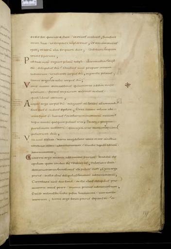 | Keywords: MCC-61050 Evangeliarium (Lebuïnuscodex) (279).jpg Artwork nl Anonymous Noordoost-Frankrijk Anonymous Rijnland Anonymous Maasland nl De kern van de boekband van de Lebuïnuscodex wordt gevormd door twee eikenhouten platten De rug en het achterplat zijn overtrokken met zeemleer Het voorplat is rijkelijk versierd met verguld zilversmeedwerk reliëfs van walrustand en verscheidene stenen De compositie van de bekleding van het voorplat wordt bepaald door een verguld zilveren filigraankruis Aan de uiteinden van de kruisarmen bevinden zich vierpassen met overhoeks vierkant eveneens met filigraan gedecoreerd Hiervan zijn er slechts twee bewaard gebleven en wel die aan de verticale kruisarmen Zij bevatten tevens nog de oorspronkelijke versiering bestaande uit een filigraanmedaillon met een pseudo-camee van respectievelijk een mannen- en een vrouwenhoofd in profiel Het snijpunt van het kruis wordt ingenomen door een ver vooruitstekend Bacchuskopje in chalcedoon te herkennen aan de kleine druiventrosjes in zijn haartooi Het kopje is gevat in een filigraanmedaillon welke op zijn beurt weer is geplaatst op een vierpas van filigraanwerk Op elk van de kruisarmen bevindt zich een ovale steen 'en cabochon' op een medaillon met filigraan Het filigraanwerk van kruis en sierstukken is in de vorm van visblazen In de ruimten tussen de kruisarmen zijn rechthoekige reliëfs van walrustand aangebracht met de vier evangelisten en hun symbool De reliëfs hebben de volgende afmetingen H 10 0 x B 5 5 cm Van links boven naar rechts onder betreft het Mattheus met de engel Johannes met de adelaar Marcus met de gevleugelde leeuw en Lucas met de gevleugelde os De figuren zijn paarsgewijs als elkaars spiegelbeeld ten opzichte van de middenas geplaatst Mattheus en Johannes zitten vrijwel geheel frontaal terwijl Marcus en Lucas meer in profiel zijn afgebeeld Qua opbouw verschillen de vier reliëfs nauwelijks van elkaar Binnen een rand van vierlobbige blaadjes verheffen zich twee zuilen met een basis een kapiteel en een dekplaat Hierop rust een rondboog geflankeerd door twee torens en afgedekt met een fronton dat boven Mattheus en Johannes boogvormig en boven Marcus en Lucas driehoekig is Onder deze overhuiving zitten de evangelisten gekleed in een lang gewaad en mantel met gekruiste benen aan een lessenaar hun blote voeten rustend op een bankje Allen zijn baardeloos en voorzien van een nimbus Voorts houden ze een pen in hun rechterhand terwijl hun linker op een boek ligt of gebarend is opgeheven Boven elk van de evangelisten verschijnt in de opening van het fronton zijn symbool met een spreukband Dit rijkelijk gedecoreerde middenveld wordt omlijst door sierbanden van verguld koper De opbouw van de sierlijsten is steeds dezelfde een opstaande smalle band die op regelmatige afstanden is voorzien van holten met aan weerszijden een brede strook voorzien van een gestanst motief Aan de lange zijden van de boekband bestaat het motief uit palmetten aan de korte zijden uit rozetten Van deze laatstgenoemde stroken ontbreekt steeds de buitenste rand Bij alle stroken met palmettenmotief wijzen de palmetten naar links met uitzondering van de buitenste strook rechtsboven die het motief in tegengestelde richting toont Verguld zilveren rozetten op de hoeken van het voorplat omgeven door een smalle rand van filigraanwerk met cirkelmotief en bekroond met een 'en cabochon' gezette steen completeren het geheel Van de rozet links onder ontbreekt de steen en is slechts de buitenste rand over Aan de voorzijde van de boekband bevinden zich nog de rudimenten van twee sluitingen between u'825' u'1000' u'1150' u'850' u'1199' u'1199' nl perkament eikenhout zilver goud koper walrustand chalcedoon glas leer Size 35 5 26 0 cm nl Hoogte 35 5cm Breedte 26 0cm Diepte 13 5cm Institution Museum Catharijneconvent object history exhibition history credit line nl Foto Museum Catharijneconvent Utrecht foto HetFotoAtelier Peter Rothengatter accession number Object number 61050 Inventory number ABM h1 place of creation https //www catharijneconvent nl/adlib/61050/ View this work on the website of Museum Catharijneconvent Museum Catharijneconvent Cc-zero <gallery> File MCC-61050_Evangeliarium_Lebuïnuscodex_ 11 jpg File MCC-61050_Evangeliarium_Lebuïnuscodex_ 172 jpg File MCC-61050_Evangeliarium_Lebuïnuscodex_ 212 jpg File MCC-61050_Evangeliarium_Lebuïnuscodex_ 61 jpg File MCC-61050_Evangeliarium_Lebuïnuscodex_ 12 jpg File MCC-61050_Evangeliarium_Lebuïnuscodex_ 213 jpg File MCC-61050_Evangeliarium_Lebuïnuscodex_ 56 jpg File MCC-61050_Evangeliarium_Lebuïnuscodex_ 232 jpg File MCC-61050_Evangeliarium_Lebuïnuscodex_ 93 jpg File MCC-61050_Evangeliarium_Lebuïnuscodex_ 99 jpg File MCC-61050_Evangeliarium_Lebuïnuscodex_ 184 jpg File MCC-61050_Evangeliarium_Lebuïnuscodex_ 64 jpg File MCC-61050_Evangeliarium_Lebuïnuscodex_ 299 jpg File MCC-61050_Evangeliarium_Lebuïnuscodex_ 86 jpg File MCC-61050_Evangeliarium_Lebuïnuscodex_ 260 jpg File MCC-61050_Evangeliarium_Lebuïnuscodex_ 159 jpg File MCC-61050_Evangeliarium_Lebuïnuscodex_ 247 jpg File MCC-61050_Evangeliarium_Lebuïnuscodex_ 180 jpg File MCC-61050_Evangeliarium_Lebuïnuscodex_ 121 jpg File MCC-61050_Evangeliarium_Lebuïnuscodex_ 315 jpg File MCC-61050_Evangeliarium_Lebuïnuscodex_ 284 jpg File MCC-61050_Evangeliarium_Lebuïnuscodex_ 33 jpg File MCC-61050_Evangeliarium_Lebuïnuscodex_ 44 jpg File MCC-61050_Evangeliarium_Lebuïnuscodex_ 258 jpg File MCC-61050_Evangeliarium_Lebuïnuscodex_ 237 jpg File MCC-61050_Evangeliarium_Lebuïnuscodex_ 20 jpg File MCC-61050_Evangeliarium_Lebuïnuscodex_ 220 jpg File MCC-61050_Evangeliarium_Lebuïnuscodex_ 279 jpg File MCC-61050_Evangeliarium_Lebuïnuscodex_ 183 jpg File MCC-61050_Evangeliarium_Lebuïnuscodex_ 60 jpg File MCC-61050_Evangeliarium_Lebuïnuscodex_ 166 jpg File MCC-61050_Evangeliarium_Lebuïnuscodex_ 97 jpg File MCC-61050_Evangeliarium_Lebuïnuscodex_ 71 jpg File MCC-61050_Evangeliarium_Lebuïnuscodex_ 132 jpg File MCC-61050_Evangeliarium_Lebuïn