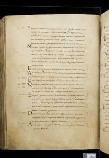 | Keywords: MCC-61050 Evangeliarium (Lebuïnuscodex) (213).jpg Artwork nl Anonymous Noordoost-Frankrijk Anonymous Rijnland Anonymous Maasland nl De kern van de boekband van de Lebuïnuscodex wordt gevormd door twee eikenhouten platten De rug en het achterplat zijn overtrokken met zeemleer Het voorplat is rijkelijk versierd met verguld zilversmeedwerk reliëfs van walrustand en verscheidene stenen De compositie van de bekleding van het voorplat wordt bepaald door een verguld zilveren filigraankruis Aan de uiteinden van de kruisarmen bevinden zich vierpassen met overhoeks vierkant eveneens met filigraan gedecoreerd Hiervan zijn er slechts twee bewaard gebleven en wel die aan de verticale kruisarmen Zij bevatten tevens nog de oorspronkelijke versiering bestaande uit een filigraanmedaillon met een pseudo-camee van respectievelijk een mannen- en een vrouwenhoofd in profiel Het snijpunt van het kruis wordt ingenomen door een ver vooruitstekend Bacchuskopje in chalcedoon te herkennen aan de kleine druiventrosjes in zijn haartooi Het kopje is gevat in een filigraanmedaillon welke op zijn beurt weer is geplaatst op een vierpas van filigraanwerk Op elk van de kruisarmen bevindt zich een ovale steen 'en cabochon' op een medaillon met filigraan Het filigraanwerk van kruis en sierstukken is in de vorm van visblazen In de ruimten tussen de kruisarmen zijn rechthoekige reliëfs van walrustand aangebracht met de vier evangelisten en hun symbool De reliëfs hebben de volgende afmetingen H 10 0 x B 5 5 cm Van links boven naar rechts onder betreft het Mattheus met de engel Johannes met de adelaar Marcus met de gevleugelde leeuw en Lucas met de gevleugelde os De figuren zijn paarsgewijs als elkaars spiegelbeeld ten opzichte van de middenas geplaatst Mattheus en Johannes zitten vrijwel geheel frontaal terwijl Marcus en Lucas meer in profiel zijn afgebeeld Qua opbouw verschillen de vier reliëfs nauwelijks van elkaar Binnen een rand van vierlobbige blaadjes verheffen zich twee zuilen met een basis een kapiteel en een dekplaat Hierop rust een rondboog geflankeerd door twee torens en afgedekt met een fronton dat boven Mattheus en Johannes boogvormig en boven Marcus en Lucas driehoekig is Onder deze overhuiving zitten de evangelisten gekleed in een lang gewaad en mantel met gekruiste benen aan een lessenaar hun blote voeten rustend op een bankje Allen zijn baardeloos en voorzien van een nimbus Voorts houden ze een pen in hun rechterhand terwijl hun linker op een boek ligt of gebarend is opgeheven Boven elk van de evangelisten verschijnt in de opening van het fronton zijn symbool met een spreukband Dit rijkelijk gedecoreerde middenveld wordt omlijst door sierbanden van verguld koper De opbouw van de sierlijsten is steeds dezelfde een opstaande smalle band die op regelmatige afstanden is voorzien van holten met aan weerszijden een brede strook voorzien van een gestanst motief Aan de lange zijden van de boekband bestaat het motief uit palmetten aan de korte zijden uit rozetten Van deze laatstgenoemde stroken ontbreekt steeds de buitenste rand Bij alle stroken met palmettenmotief wijzen de palmetten naar links met uitzondering van de buitenste strook rechtsboven die het motief in tegengestelde richting toont Verguld zilveren rozetten op de hoeken van het voorplat omgeven door een smalle rand van filigraanwerk met cirkelmotief en bekroond met een 'en cabochon' gezette steen completeren het geheel Van de rozet links onder ontbreekt de steen en is slechts de buitenste rand over Aan de voorzijde van de boekband bevinden zich nog de rudimenten van twee sluitingen between u'825' u'1000' u'1150' u'850' u'1199' u'1199' nl perkament eikenhout zilver goud koper walrustand chalcedoon glas leer Size 35 5 26 0 cm nl Hoogte 35 5cm Breedte 26 0cm Diepte 13 5cm Institution Museum Catharijneconvent object history exhibition history credit line nl Foto Museum Catharijneconvent Utrecht foto HetFotoAtelier Peter Rothengatter accession number Object number 61050 Inventory number ABM h1 place of creation https //www catharijneconvent nl/adlib/61050/ View this work on the website of Museum Catharijneconvent Museum Catharijneconvent Cc-zero <gallery> File MCC-61050_Evangeliarium_Lebuïnuscodex_ 11 jpg File MCC-61050_Evangeliarium_Lebuïnuscodex_ 172 jpg File MCC-61050_Evangeliarium_Lebuïnuscodex_ 212 jpg File MCC-61050_Evangeliarium_Lebuïnuscodex_ 61 jpg File MCC-61050_Evangeliarium_Lebuïnuscodex_ 12 jpg File MCC-61050_Evangeliarium_Lebuïnuscodex_ 213 jpg File MCC-61050_Evangeliarium_Lebuïnuscodex_ 56 jpg File MCC-61050_Evangeliarium_Lebuïnuscodex_ 232 jpg File MCC-61050_Evangeliarium_Lebuïnuscodex_ 93 jpg File MCC-61050_Evangeliarium_Lebuïnuscodex_ 99 jpg File MCC-61050_Evangeliarium_Lebuïnuscodex_ 184 jpg File MCC-61050_Evangeliarium_Lebuïnuscodex_ 64 jpg File MCC-61050_Evangeliarium_Lebuïnuscodex_ 299 jpg File MCC-61050_Evangeliarium_Lebuïnuscodex_ 86 jpg File MCC-61050_Evangeliarium_Lebuïnuscodex_ 260 jpg File MCC-61050_Evangeliarium_Lebuïnuscodex_ 159 jpg File MCC-61050_Evangeliarium_Lebuïnuscodex_ 247 jpg File MCC-61050_Evangeliarium_Lebuïnuscodex_ 180 jpg File MCC-61050_Evangeliarium_Lebuïnuscodex_ 121 jpg File MCC-61050_Evangeliarium_Lebuïnuscodex_ 315 jpg File MCC-61050_Evangeliarium_Lebuïnuscodex_ 284 jpg File MCC-61050_Evangeliarium_Lebuïnuscodex_ 33 jpg File MCC-61050_Evangeliarium_Lebuïnuscodex_ 44 jpg File MCC-61050_Evangeliarium_Lebuïnuscodex_ 258 jpg File MCC-61050_Evangeliarium_Lebuïnuscodex_ 237 jpg File MCC-61050_Evangeliarium_Lebuïnuscodex_ 20 jpg File MCC-61050_Evangeliarium_Lebuïnuscodex_ 220 jpg File MCC-61050_Evangeliarium_Lebuïnuscodex_ 279 jpg File MCC-61050_Evangeliarium_Lebuïnuscodex_ 183 jpg File MCC-61050_Evangeliarium_Lebuïnuscodex_ 60 jpg File MCC-61050_Evangeliarium_Lebuïnuscodex_ 166 jpg File MCC-61050_Evangeliarium_Lebuïnuscodex_ 97 jpg File MCC-61050_Evangeliarium_Lebuïnuscodex_ 71 jpg File MCC-61050_Evangeliarium_Lebuïnuscodex_ 132 jpg File MCC-61050_Evangeliarium_Lebuïn