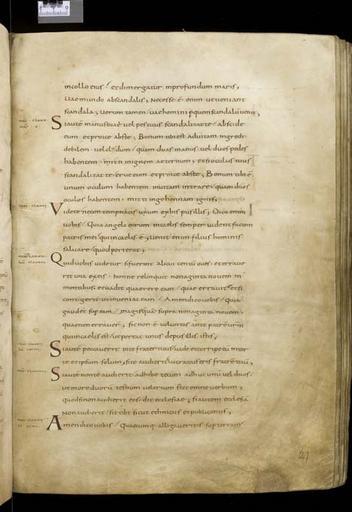 | Keywords: MCC-61050 Evangeliarium (Lebuïnuscodex) (56).jpg Artwork nl Anonymous Noordoost-Frankrijk Anonymous Rijnland Anonymous Maasland nl De kern van de boekband van de Lebuïnuscodex wordt gevormd door twee eikenhouten platten De rug en het achterplat zijn overtrokken met zeemleer Het voorplat is rijkelijk versierd met verguld zilversmeedwerk reliëfs van walrustand en verscheidene stenen De compositie van de bekleding van het voorplat wordt bepaald door een verguld zilveren filigraankruis Aan de uiteinden van de kruisarmen bevinden zich vierpassen met overhoeks vierkant eveneens met filigraan gedecoreerd Hiervan zijn er slechts twee bewaard gebleven en wel die aan de verticale kruisarmen Zij bevatten tevens nog de oorspronkelijke versiering bestaande uit een filigraanmedaillon met een pseudo-camee van respectievelijk een mannen- en een vrouwenhoofd in profiel Het snijpunt van het kruis wordt ingenomen door een ver vooruitstekend Bacchuskopje in chalcedoon te herkennen aan de kleine druiventrosjes in zijn haartooi Het kopje is gevat in een filigraanmedaillon welke op zijn beurt weer is geplaatst op een vierpas van filigraanwerk Op elk van de kruisarmen bevindt zich een ovale steen 'en cabochon' op een medaillon met filigraan Het filigraanwerk van kruis en sierstukken is in de vorm van visblazen In de ruimten tussen de kruisarmen zijn rechthoekige reliëfs van walrustand aangebracht met de vier evangelisten en hun symbool De reliëfs hebben de volgende afmetingen H 10 0 x B 5 5 cm Van links boven naar rechts onder betreft het Mattheus met de engel Johannes met de adelaar Marcus met de gevleugelde leeuw en Lucas met de gevleugelde os De figuren zijn paarsgewijs als elkaars spiegelbeeld ten opzichte van de middenas geplaatst Mattheus en Johannes zitten vrijwel geheel frontaal terwijl Marcus en Lucas meer in profiel zijn afgebeeld Qua opbouw verschillen de vier reliëfs nauwelijks van elkaar Binnen een rand van vierlobbige blaadjes verheffen zich twee zuilen met een basis een kapiteel en een dekplaat Hierop rust een rondboog geflankeerd door twee torens en afgedekt met een fronton dat boven Mattheus en Johannes boogvormig en boven Marcus en Lucas driehoekig is Onder deze overhuiving zitten de evangelisten gekleed in een lang gewaad en mantel met gekruiste benen aan een lessenaar hun blote voeten rustend op een bankje Allen zijn baardeloos en voorzien van een nimbus Voorts houden ze een pen in hun rechterhand terwijl hun linker op een boek ligt of gebarend is opgeheven Boven elk van de evangelisten verschijnt in de opening van het fronton zijn symbool met een spreukband Dit rijkelijk gedecoreerde middenveld wordt omlijst door sierbanden van verguld koper De opbouw van de sierlijsten is steeds dezelfde een opstaande smalle band die op regelmatige afstanden is voorzien van holten met aan weerszijden een brede strook voorzien van een gestanst motief Aan de lange zijden van de boekband bestaat het motief uit palmetten aan de korte zijden uit rozetten Van deze laatstgenoemde stroken ontbreekt steeds de buitenste rand Bij alle stroken met palmettenmotief wijzen de palmetten naar links met uitzondering van de buitenste strook rechtsboven die het motief in tegengestelde richting toont Verguld zilveren rozetten op de hoeken van het voorplat omgeven door een smalle rand van filigraanwerk met cirkelmotief en bekroond met een 'en cabochon' gezette steen completeren het geheel Van de rozet links onder ontbreekt de steen en is slechts de buitenste rand over Aan de voorzijde van de boekband bevinden zich nog de rudimenten van twee sluitingen between u'825' u'1000' u'1150' u'850' u'1199' u'1199' nl perkament eikenhout zilver goud koper walrustand chalcedoon glas leer Size 35 5 26 0 cm nl Hoogte 35 5cm Breedte 26 0cm Diepte 13 5cm Institution Museum Catharijneconvent object history exhibition history credit line nl Foto Museum Catharijneconvent Utrecht foto HetFotoAtelier Peter Rothengatter accession number Object number 61050 Inventory number ABM h1 place of creation https //www catharijneconvent nl/adlib/61050/ View this work on the website of Museum Catharijneconvent Museum Catharijneconvent Cc-zero <gallery> File MCC-61050_Evangeliarium_Lebuïnuscodex_ 11 jpg File MCC-61050_Evangeliarium_Lebuïnuscodex_ 172 jpg File MCC-61050_Evangeliarium_Lebuïnuscodex_ 212 jpg File MCC-61050_Evangeliarium_Lebuïnuscodex_ 61 jpg File MCC-61050_Evangeliarium_Lebuïnuscodex_ 12 jpg File MCC-61050_Evangeliarium_Lebuïnuscodex_ 213 jpg File MCC-61050_Evangeliarium_Lebuïnuscodex_ 56 jpg File MCC-61050_Evangeliarium_Lebuïnuscodex_ 232 jpg File MCC-61050_Evangeliarium_Lebuïnuscodex_ 93 jpg File MCC-61050_Evangeliarium_Lebuïnuscodex_ 99 jpg File MCC-61050_Evangeliarium_Lebuïnuscodex_ 184 jpg File MCC-61050_Evangeliarium_Lebuïnuscodex_ 64 jpg File MCC-61050_Evangeliarium_Lebuïnuscodex_ 299 jpg File MCC-61050_Evangeliarium_Lebuïnuscodex_ 86 jpg File MCC-61050_Evangeliarium_Lebuïnuscodex_ 260 jpg File MCC-61050_Evangeliarium_Lebuïnuscodex_ 159 jpg File MCC-61050_Evangeliarium_Lebuïnuscodex_ 247 jpg File MCC-61050_Evangeliarium_Lebuïnuscodex_ 180 jpg File MCC-61050_Evangeliarium_Lebuïnuscodex_ 121 jpg File MCC-61050_Evangeliarium_Lebuïnuscodex_ 315 jpg File MCC-61050_Evangeliarium_Lebuïnuscodex_ 284 jpg File MCC-61050_Evangeliarium_Lebuïnuscodex_ 33 jpg File MCC-61050_Evangeliarium_Lebuïnuscodex_ 44 jpg File MCC-61050_Evangeliarium_Lebuïnuscodex_ 258 jpg File MCC-61050_Evangeliarium_Lebuïnuscodex_ 237 jpg File MCC-61050_Evangeliarium_Lebuïnuscodex_ 20 jpg File MCC-61050_Evangeliarium_Lebuïnuscodex_ 220 jpg File MCC-61050_Evangeliarium_Lebuïnuscodex_ 279 jpg File MCC-61050_Evangeliarium_Lebuïnuscodex_ 183 jpg File MCC-61050_Evangeliarium_Lebuïnuscodex_ 60 jpg File MCC-61050_Evangeliarium_Lebuïnuscodex_ 166 jpg File MCC-61050_Evangeliarium_Lebuïnuscodex_ 97 jpg File MCC-61050_Evangeliarium_Lebuïnuscodex_ 71 jpg File MCC-61050_Evangeliarium_Lebuïnuscodex_ 132 jpg File MCC-61050_Evangeliarium_Lebuïnu